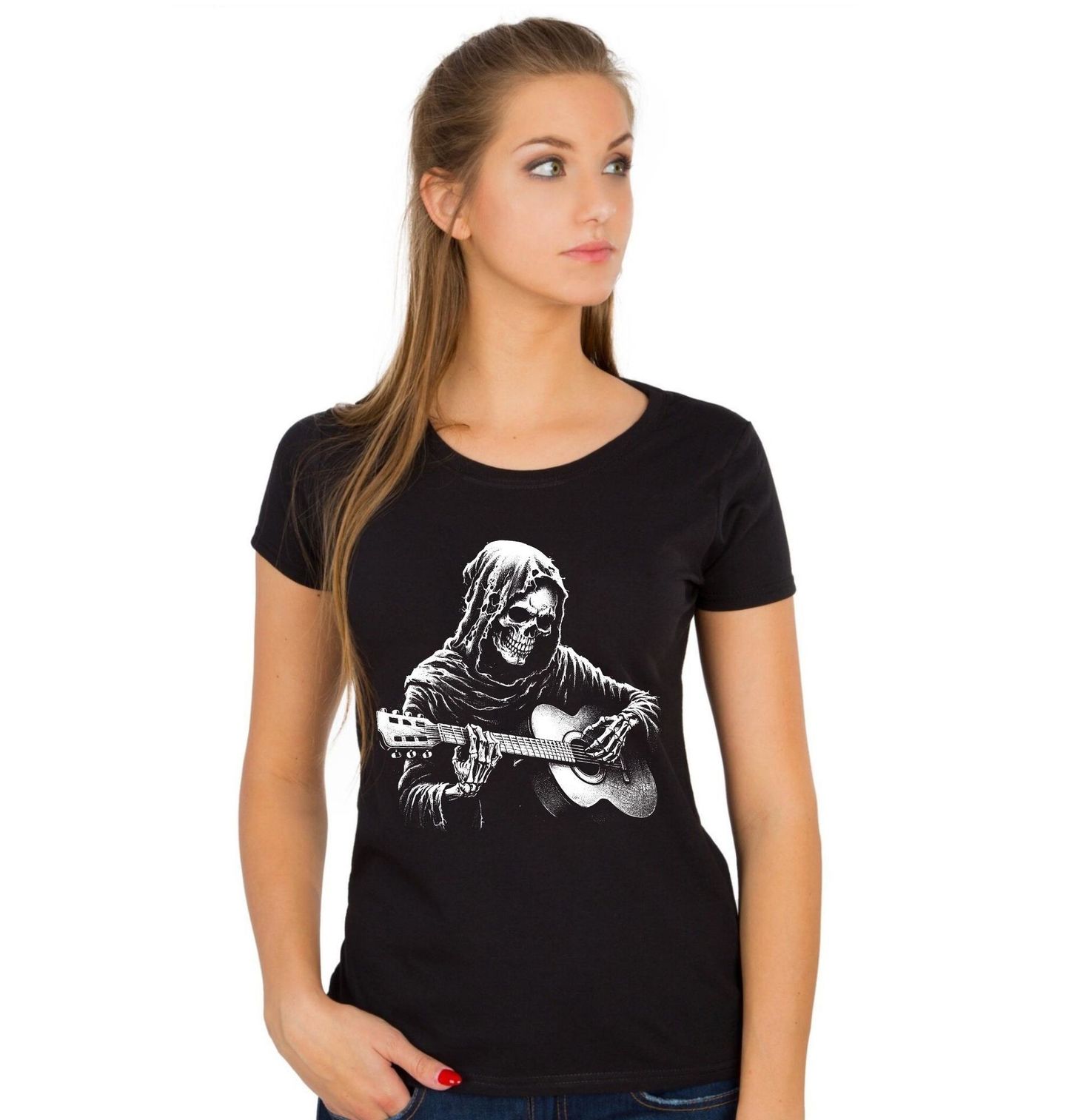 Dámské tričko Smrtka s Akustickou Kytarou. Originální motiv, kde kostlivec a temná kytara, spojuje temnotu, humor a rockový styl. Tenhle design je jako stvořený pro milovníky hudby, metalu, gotiky i temné estetiky. Ideální jako dárek pro muzikanty, rockery i fanoušky netradiční grafiky.