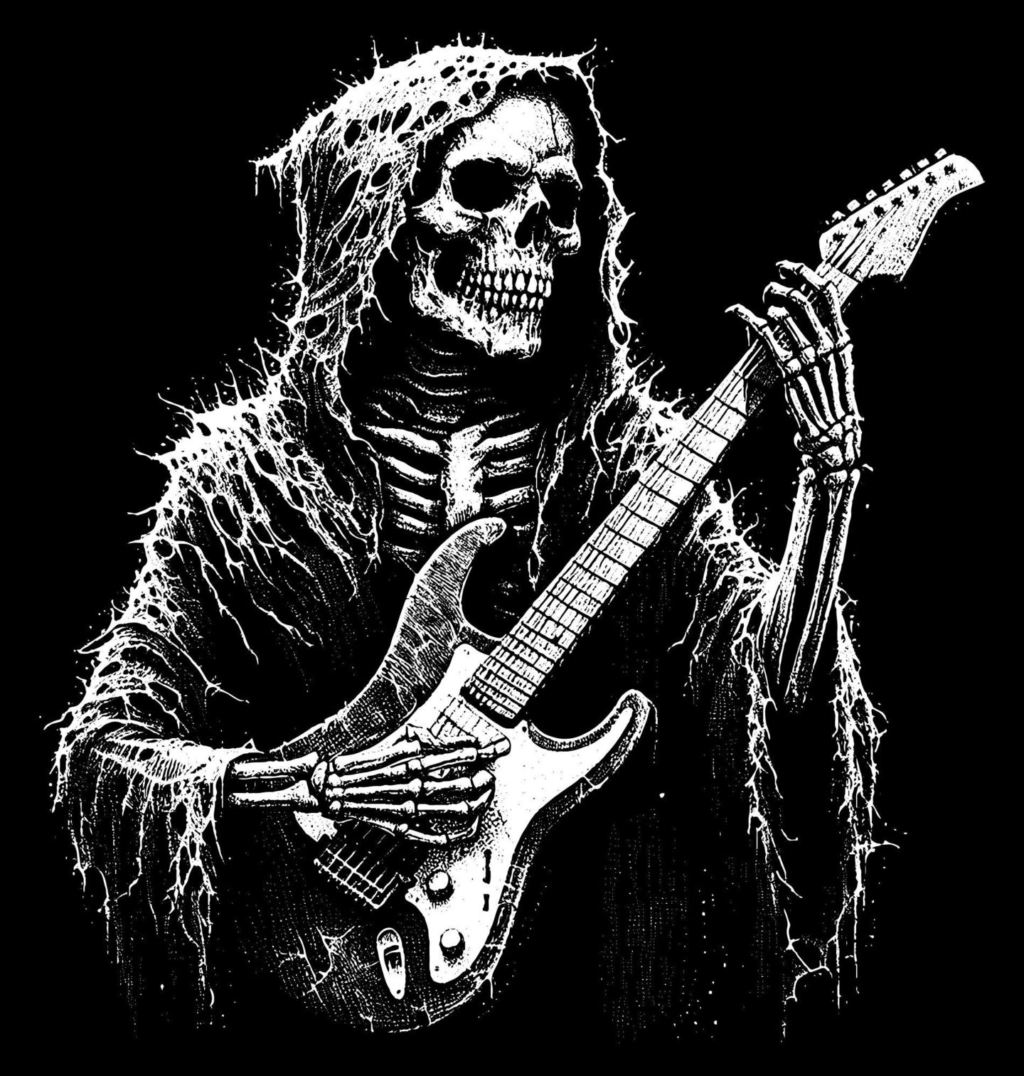Pánské tričko Smrtka s Elektrickou Kytarou. Temná a stylová ilustrace, kde vystupuje smrtka v roztrhané kápi, která jako pravý rocker drží v rukou elektrickou kytara. Detaily kostí a stínování dodávají motivu dramatickou atmosféru — jako by se samotný kostlivec chystal rozezvučet poslední koncert na hraně života a smrti.