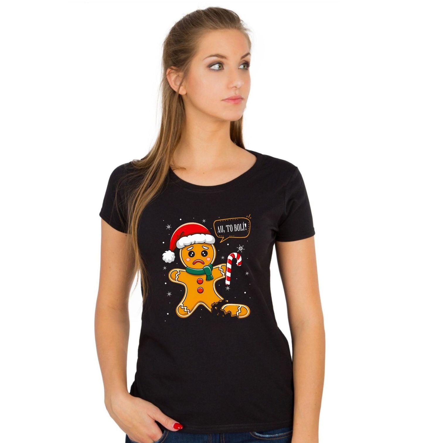 Dámské tričko Smutný Perníček Au, to bolí! Roztomilý, ale zároveň lehce dramatický motiv s perníčkem, kterého Vánoce opravdu „bolely“. Zlomená noha, smutný výraz a hláška „Au, to bolí!“ dělají z tohoto designu vtipnou a originální připomínku, že perníček to ve svátečním období nemá vůbec lehké.