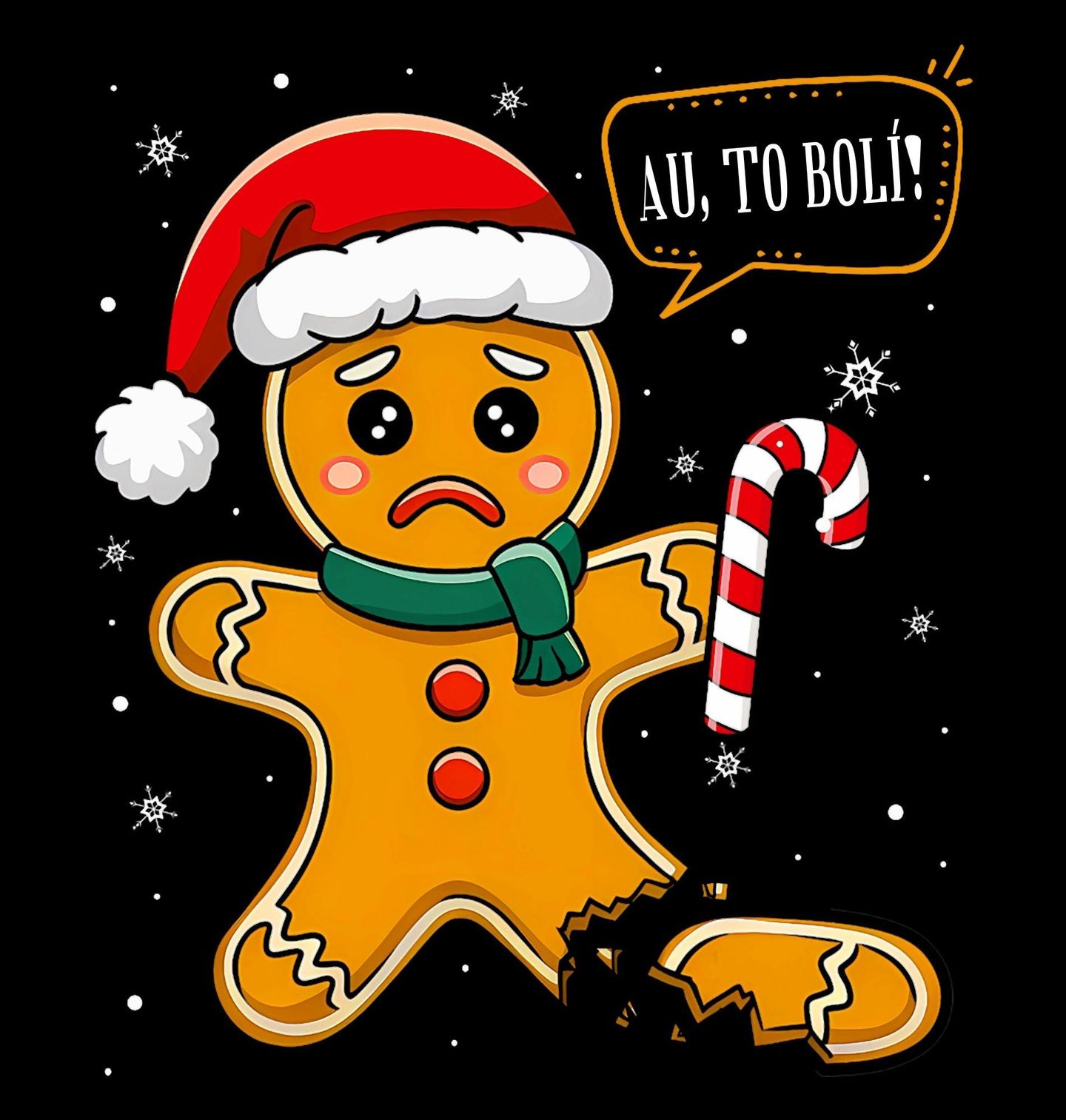 Dětské tričko Smutný Perníček Au, to bolí! Roztomilý, ale zároveň lehce dramatický motiv s perníčkem, kterého Vánoce opravdu „bolely“. Zlomená noha, smutný výraz a hláška „Au, to bolí!“ dělají z tohoto designu vtipnou a originální připomínku, že perníček to ve svátečním období nemá vůbec lehké.