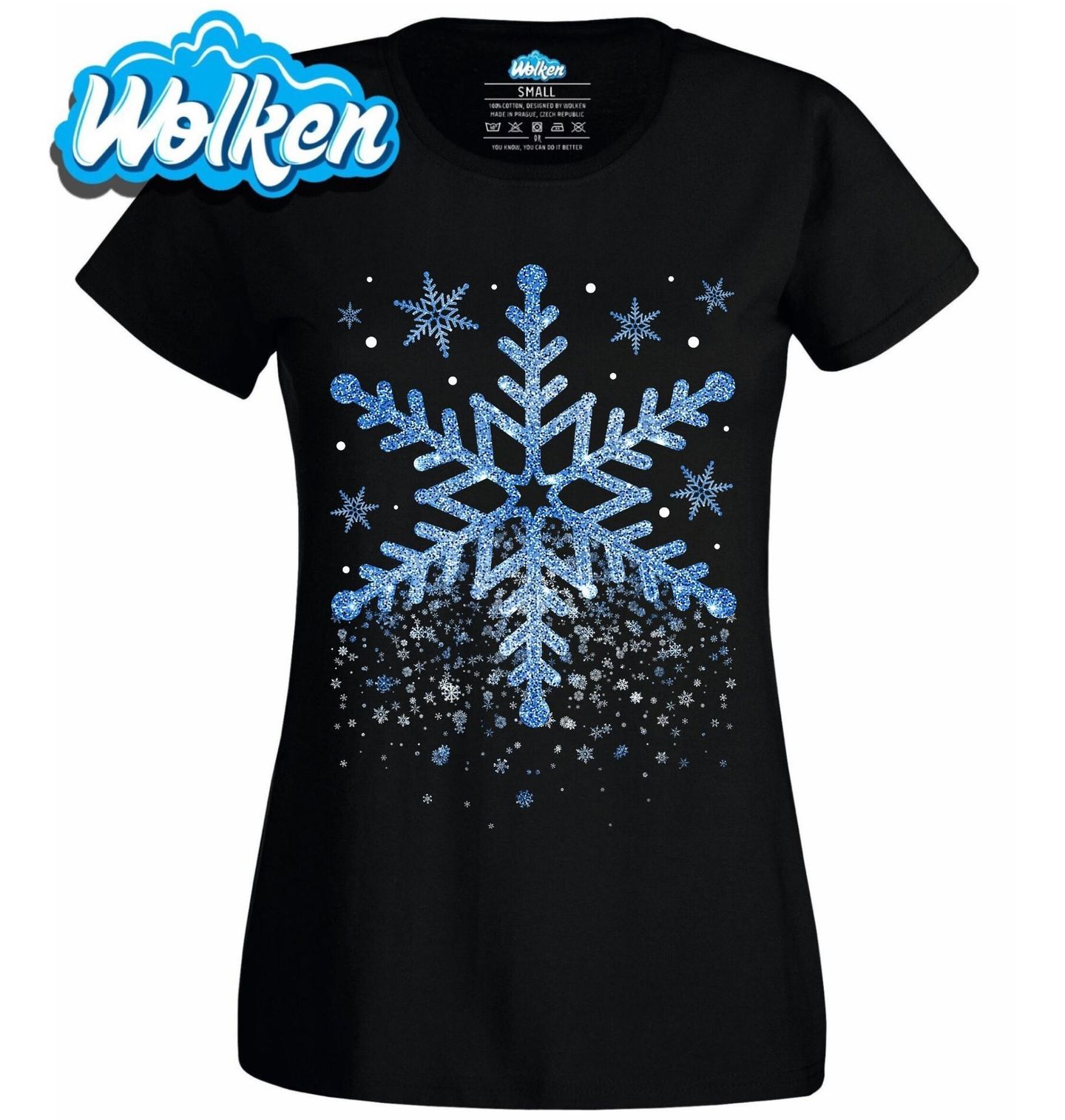 Dámské tričko Sněhová Vánoční Vločka. Oslavte Vánoce stylově s tímto jedinečným motivem! Třpytivá vločka zářící na černém pozadí přináší do každého outfitu kouzlo zimy a radost, kterou přinese jen první sníh. Perfektní volba pro zimní období, milovníky ledových motivů i vánočních svátků.