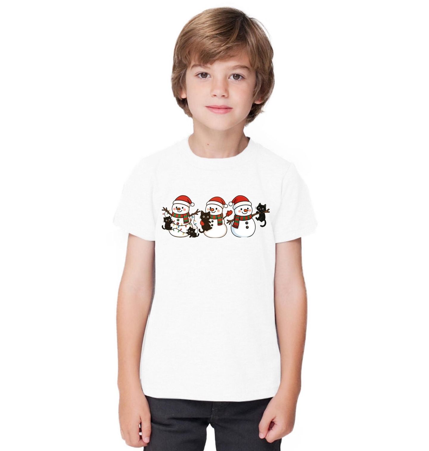 Dětské tričko Sněhuláci a Hravá Koťata. Kouzelný motiv pro milovníky Vánoc i koček! Roztomilí sněhuláci v červených čepicích a šálách si užívají Vánoce ve společnosti hravých černých koček. Vánoce, sněhulák a kočka v jednom motivu – perfektní volba pro každého, kdo miluje zimu s dotekem hravosti a roztomilosti.