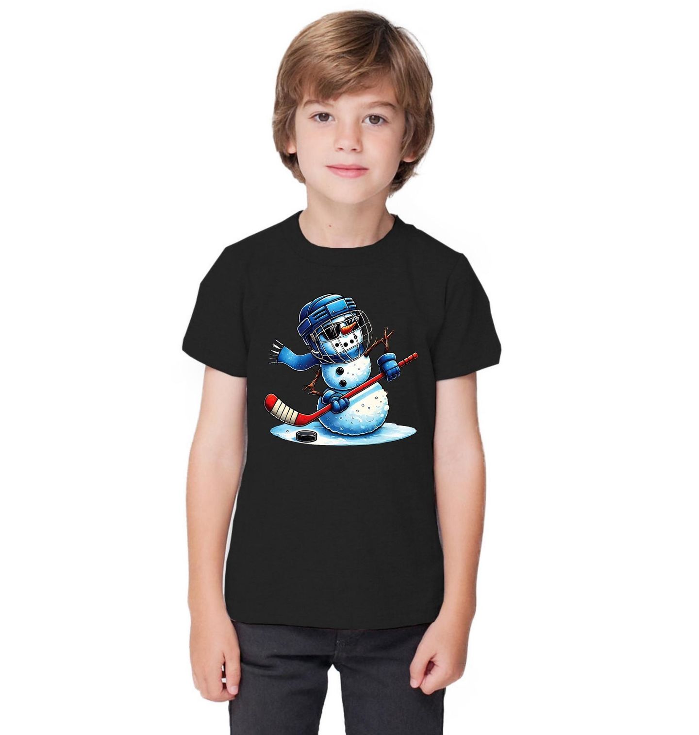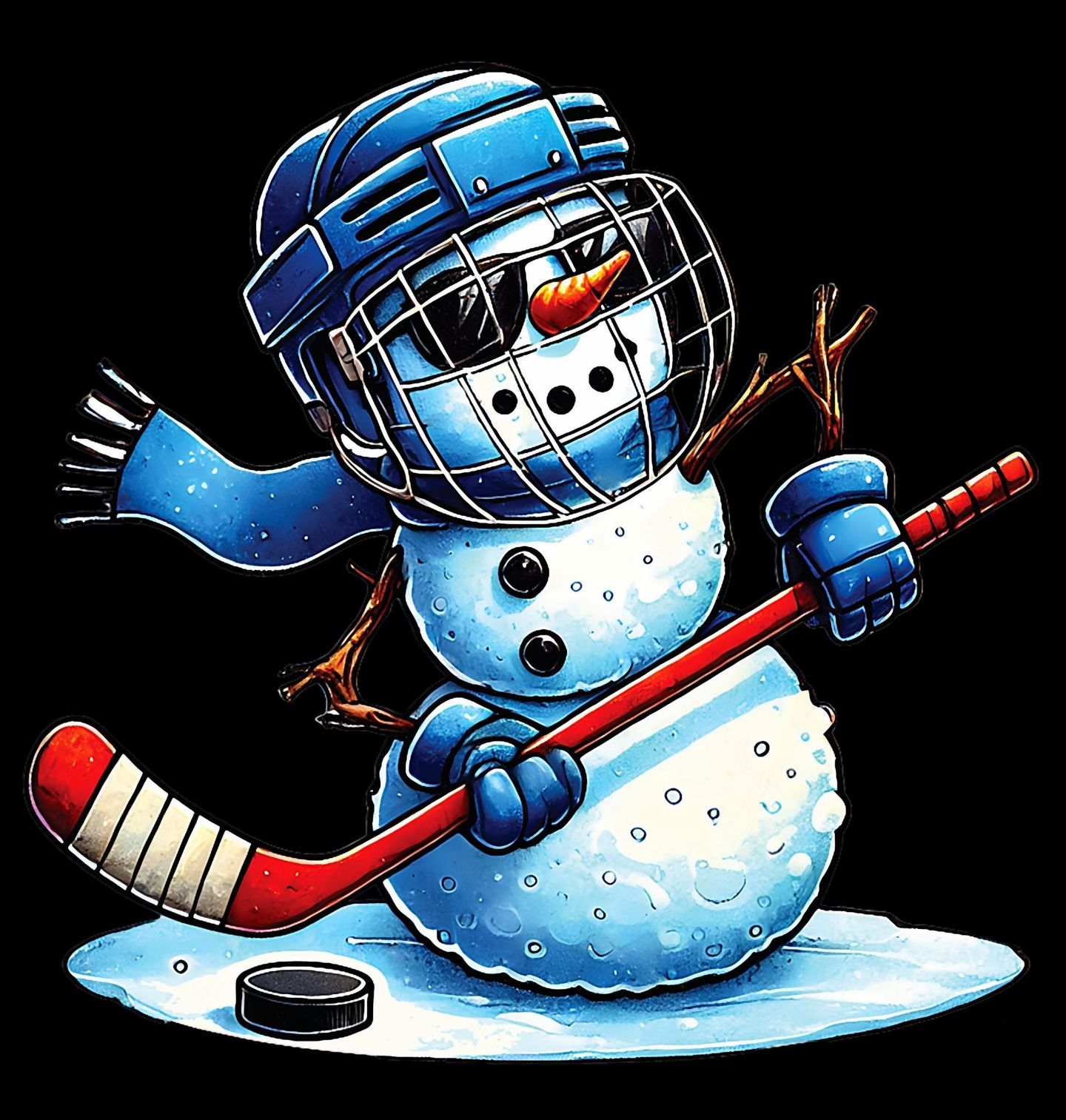 Dětské tričko Sněhulák Brankář s Pukem. Originální vánoční potisk pro všechny milovníky zimy, sportu a humoru! Stylový sněhulák s hokejkou, helmou, brýlemi a modrou šálou připravený bránit led za každou cenu – to je dokonalý hrdina na každé Vánoce.
