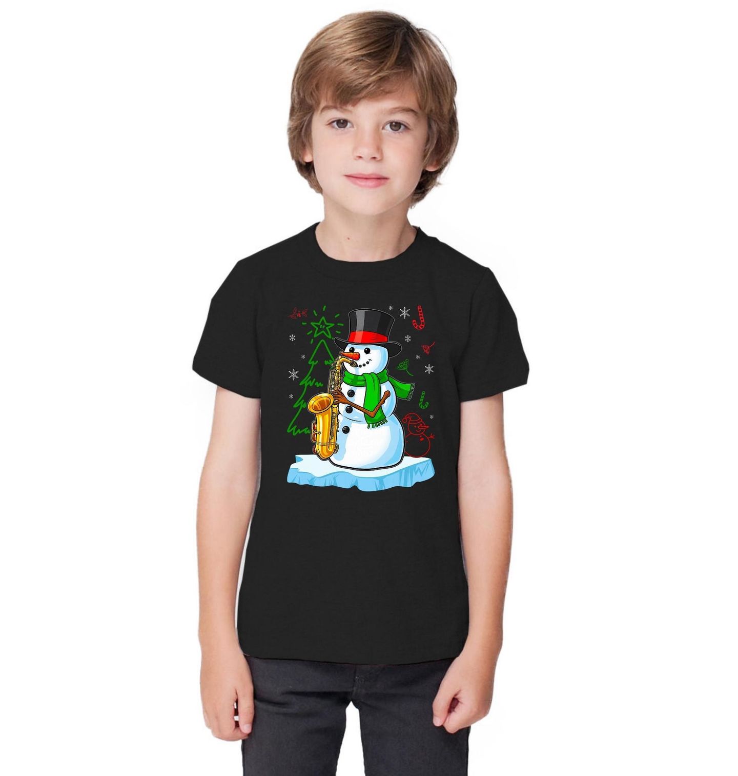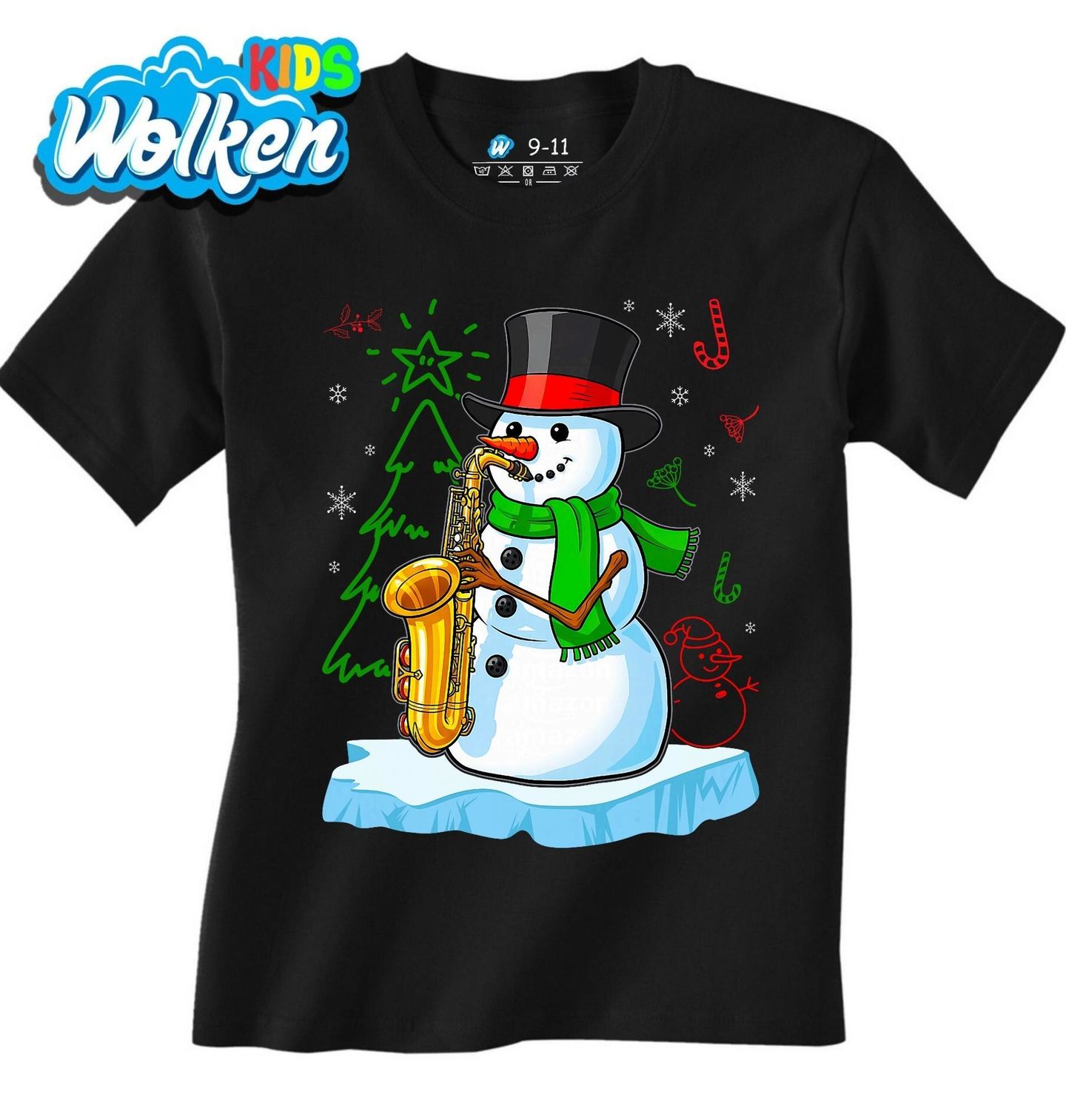 Dětské tričko Sněhulák se Saxofonem. Tento originální motiv přináší sváteční atmosféru trochu jinak – sněhulák v elegantním klobouku hraje na saxofon a šíří kolem sebe kouzlo hudby. Ideální dárek pro hudebníky, jazzové nadšence nebo prostě každého, kdo má rád Vánoce.