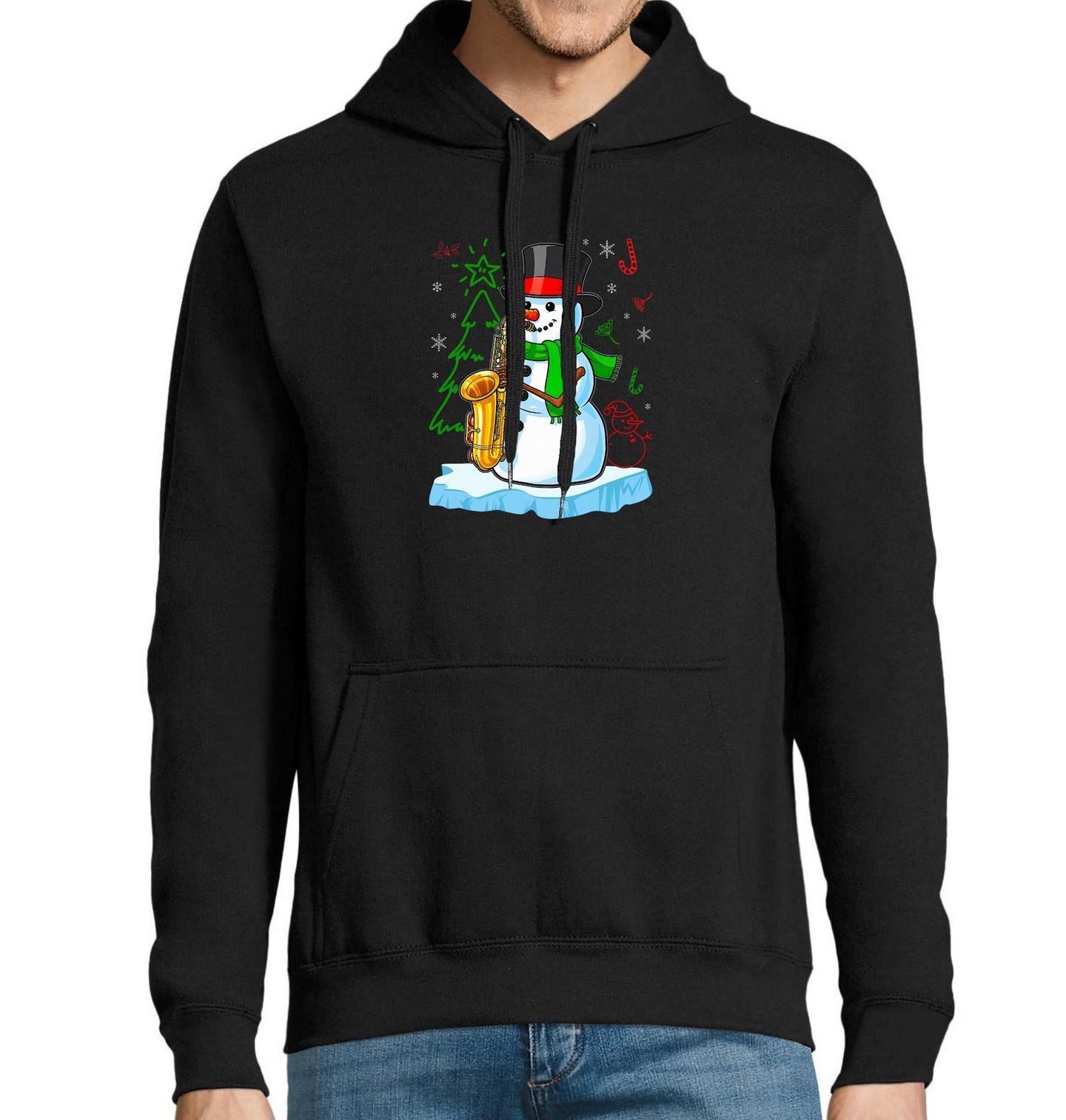 Pánská mikina Sněhulák se Saxofonem. Tento originální motiv přináší sváteční atmosféru trochu jinak – sněhulák v elegantním klobouku hraje na saxofon a šíří kolem sebe kouzlo hudby. Ideální dárek pro hudebníky, jazzové nadšence nebo prostě každého, kdo má rád Vánoce.