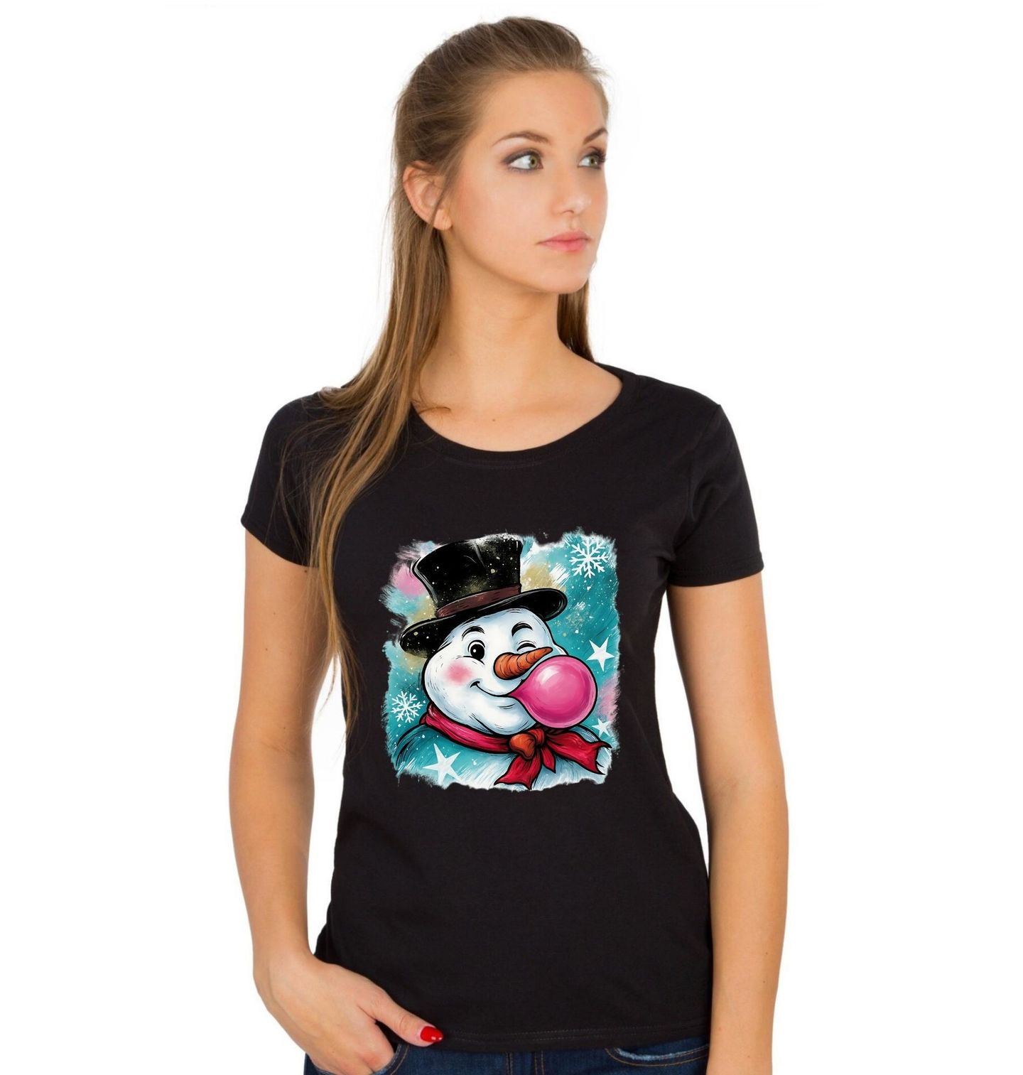 Dámské tričko Sněhulák se Žvýkačkou. Stylový sněhulák, který místo tradičního úsměvu fouká bublinu ze žvýkačky, přináší do Vánoc trochu rebelství a hravosti! Tento design je ideální volbou pro každého, kdo miluje Vánoce, humor a nebojí se vyčnívat z davu.