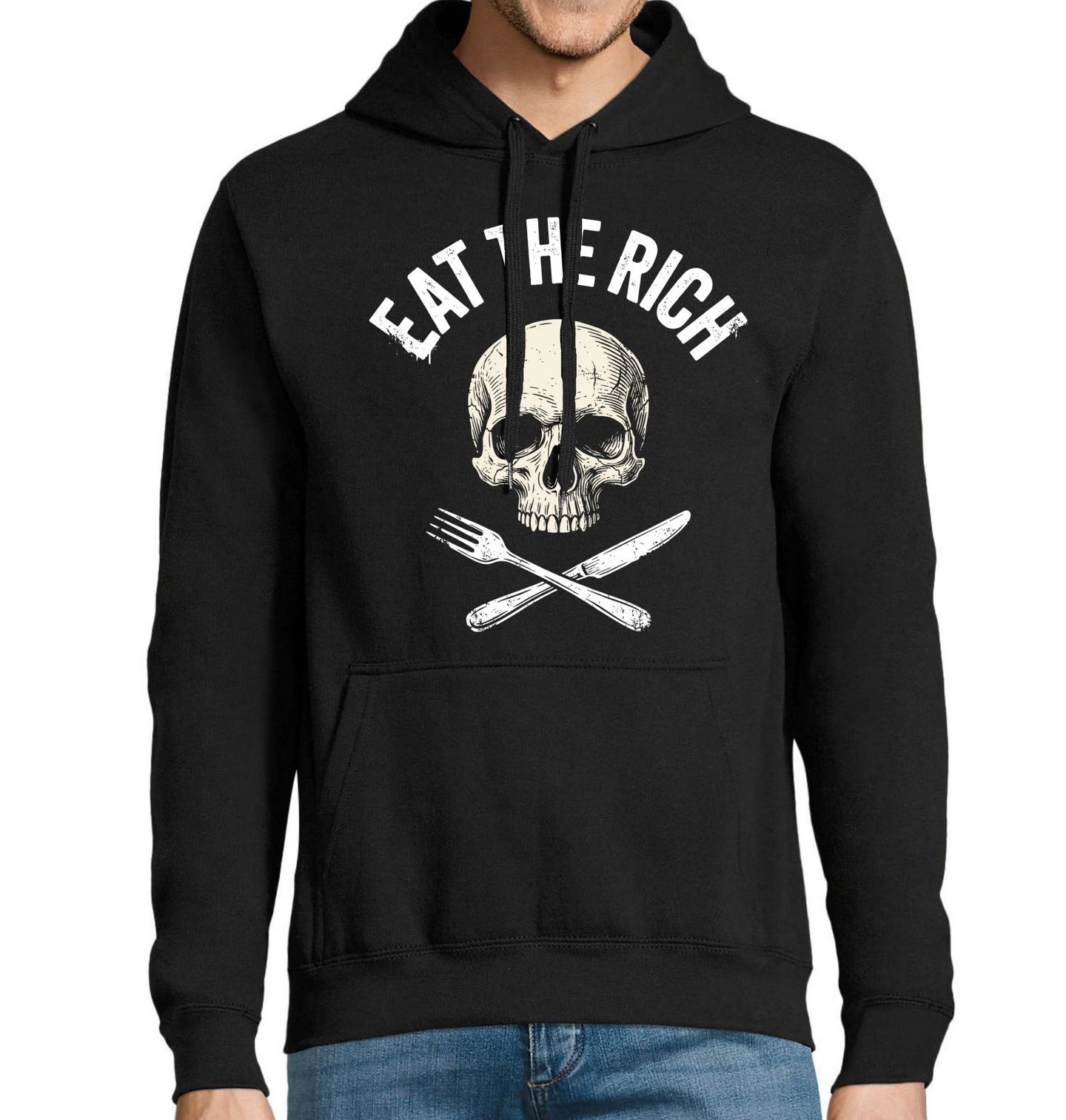 Pánská mikina Sněz Bohaté Eat the Rich. Výrazná lebka a zkřížené příbory přináší drsnou rebel atmosféru v minimalistickém stylu. Na motivu je anglický nápis „eat the rich“, což lze přeložit jako „sněz bohaté“ nebo volněji „postav se proti elitám“. Grafika působí provokativně, punkově a skvěle zapadne do streetwear i alternativního stylu.
