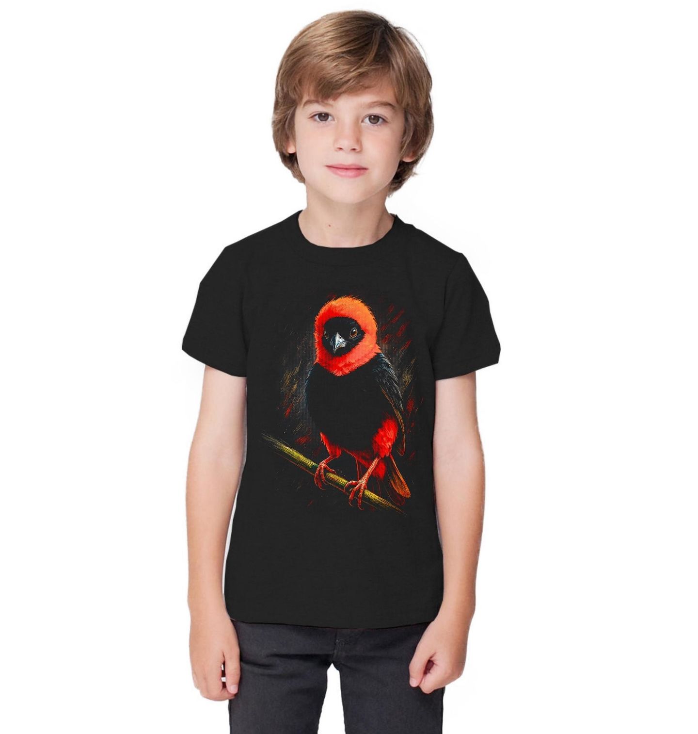 Dětské tričko Snovač kaferský. Výrazný pták snovač červenohlavý (Anaplectes rubriceps) je fascinující druh známý svým kontrastním zbarvením a nápadnou červenou hlavou. Tento stylizovaný motiv zachycuje pták snovač červenohlavý v dramatickém světle, které podtrhuje jeho exotickou krásu a tajemnou atmosféru africké přírody.