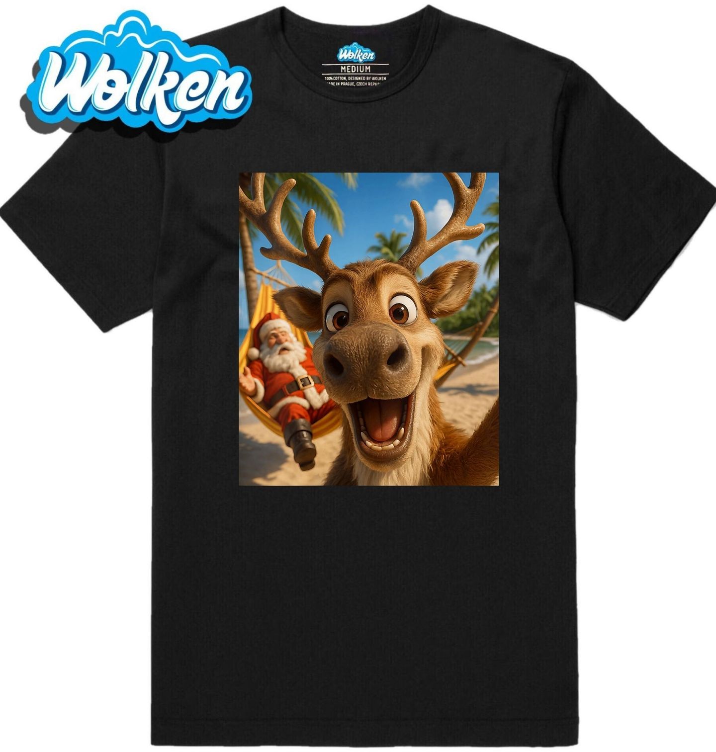 Pánské tričko Sob a Santa u moře Selfie z Dovolené. Usměvavý sob pózuje na pláži, zatímco Santa Claus odpočívá v houpací síti pod palmami. Vánoce, sob a Santa se tak přenesli z mrazivé zimy přímo do teplého ráje u moře. Ideální volba pro ty, kteří chtějí Vánoce oslavit s úsměvem, lehkostí a špetkou humoru.