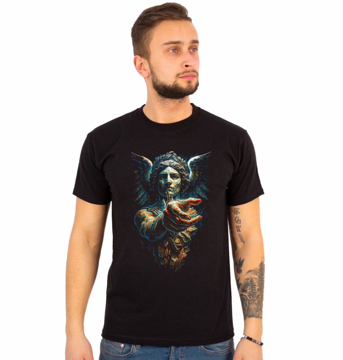Pánské tričko Socha Archanděla Michaela. Tohle je typický motiv právě pro archanděla Michaela, který je zobrazován jako bojovník porážející draka nebo hada (symbol Satana). S roztaženými křídly a rozhodným gestem ruky působí jako soudce i ochránce zároveň. Pod jeho rukou se nachází had – tradiční symbol zla a temnoty. Michael jej ovládá, což vyjadřuje vítězství světla nad hříchem a chaosu nad řádem.