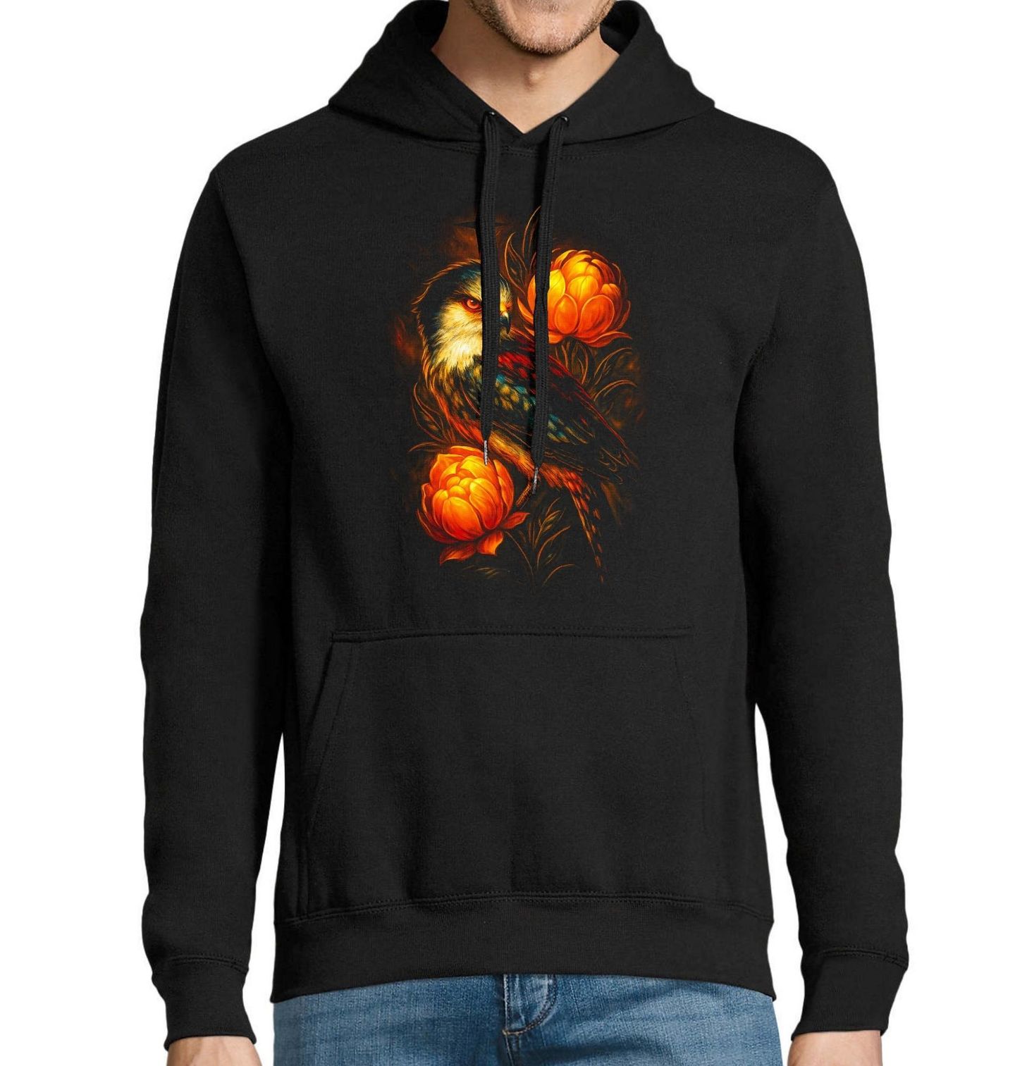 Pánská mikina Sokol stěhovavý. Tento výrazný motiv zachycuje dravý pták inspirovaný sokolem, symbolem rychlosti, síly a odvahy. Stylizovaný sokol s pronikavým pohledem sedí mezi zářivými květy v teplých ohnivých barvách, které vytvářejí tajemnou a elegantní atmosféru. Pták působí majestátně a zároveň moderně, takže se motiv skvěle hodí pro milovníky přírody, dravců i originálního designu.