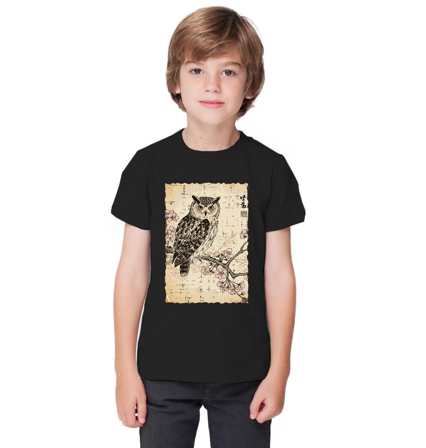 Dětské tričko Sova na Větvi Sakury Ukiyo-e Art. Tento jedinečný motiv spojuje jemnou krásu tradiční japonské estetiky s mystickým klidem lesa. Sova sedící na větvi rozkvetlé sakury symbolizuje moudrost, ticho a sílu okamžiku. Design je inspirován historickými japonskými tisky a přenáší atmosféru jako dávné Japonsko.