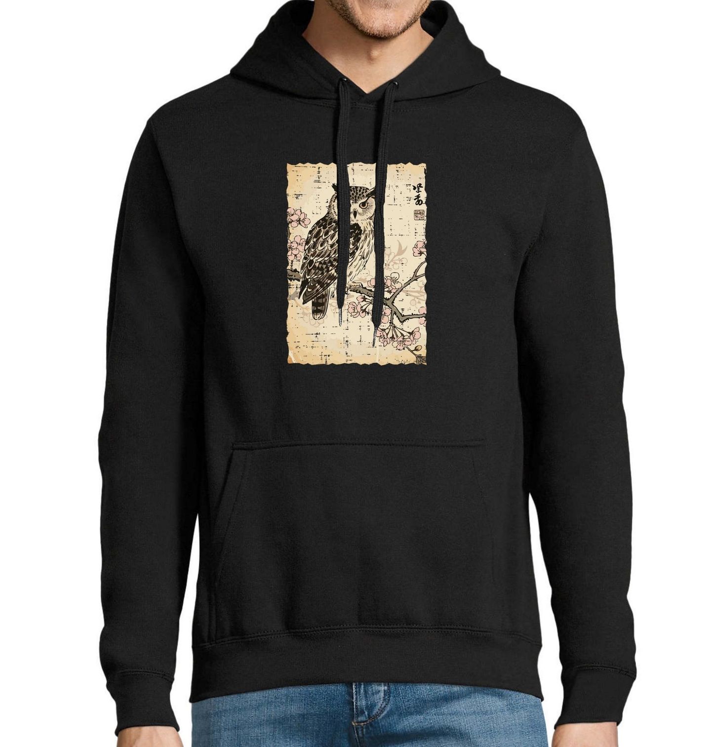 Pánská mikina Sova na Větvi Sakury Ukiyo-e Art. Tento jedinečný motiv spojuje jemnou krásu tradiční japonské estetiky s mystickým klidem lesa. Sova sedící na větvi rozkvetlé sakury symbolizuje moudrost, ticho a sílu okamžiku. Design je inspirován historickými japonskými tisky a přenáší atmosféru jako dávné Japonsko.