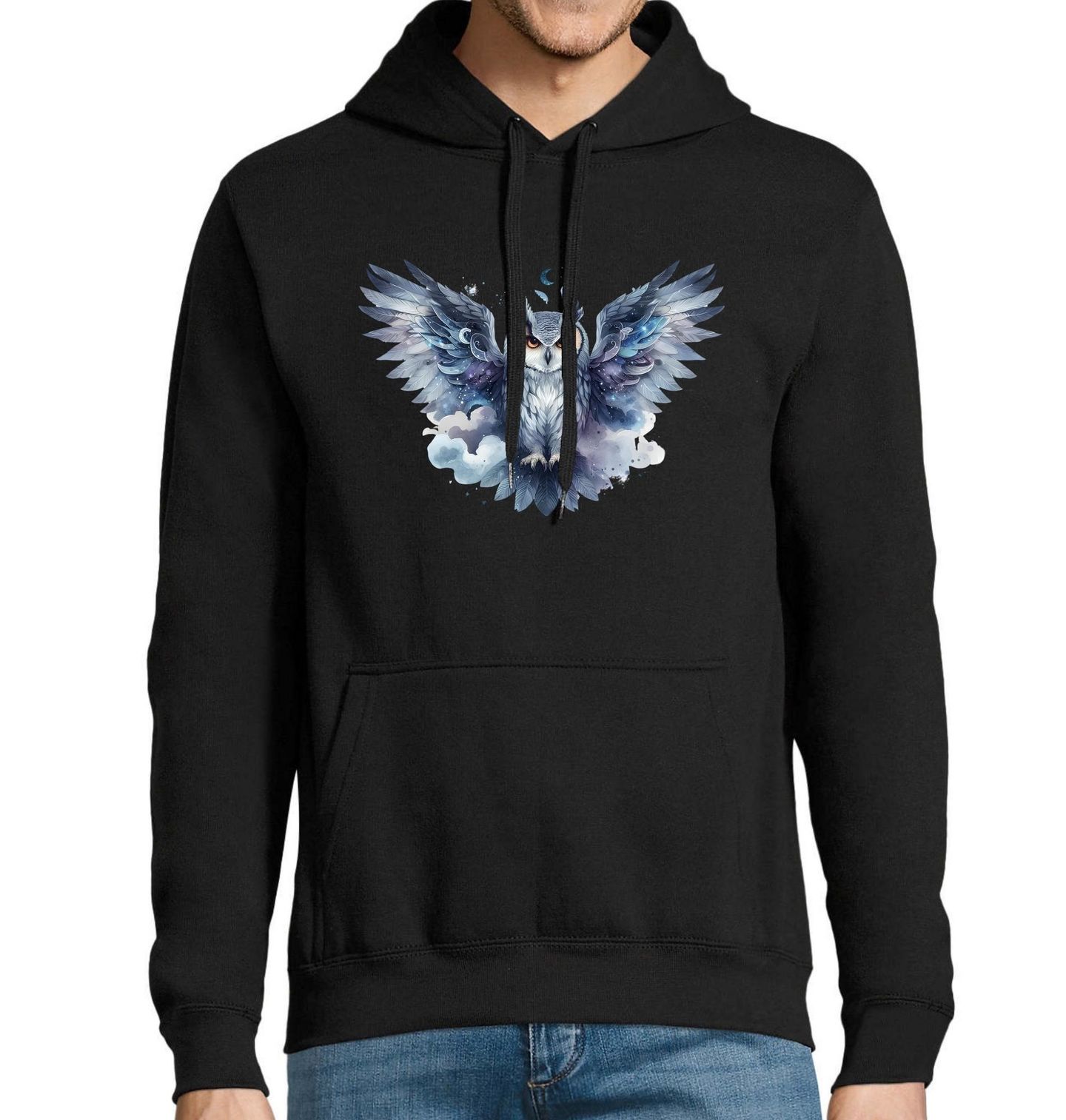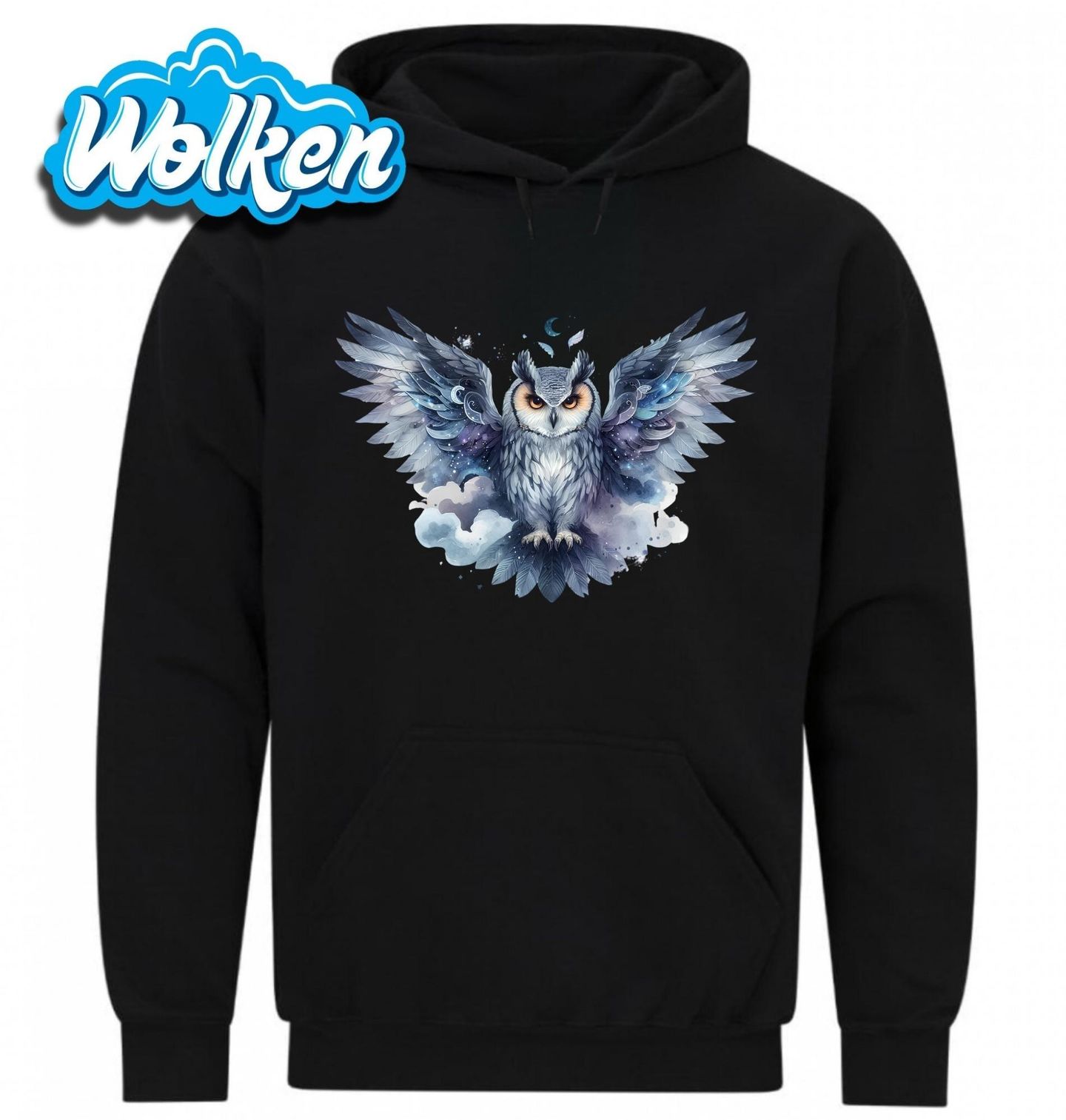 Pánská mikina Sova Strážkyně Hvězd. Tajemná sova s rozpjatými křídly se vznáší nad temným lesem a nese v sobě kouzlo noční oblohy. Tento magický motiv propojuje symboliku sovy jako moudré strážkyně s tichou silou hlubokého lesa. Triko je ideální pro milovníky přírody, zvířat a mystiky.