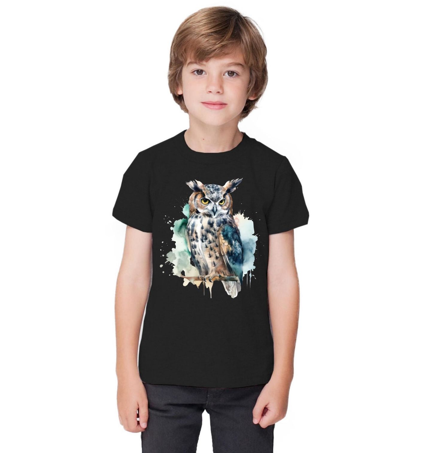 Dětské tričko Sova Výr Velký. Výrazný motiv, kde dominuje majestátní sova inspirovaná druhem výr velký. Detailní akvarelové zpracování zvýrazňuje pronikavé oči, jemnou kresbu peří i přirozenou eleganci tohoto nočního lovce. Barevné skvrny v pozadí dodávají ilustraci moderní umělecký styl, díky kterému sova působí stylově a originálně.