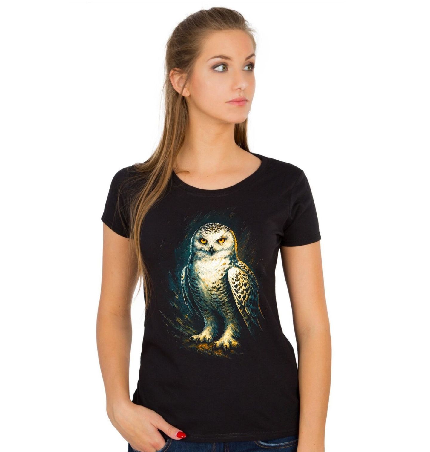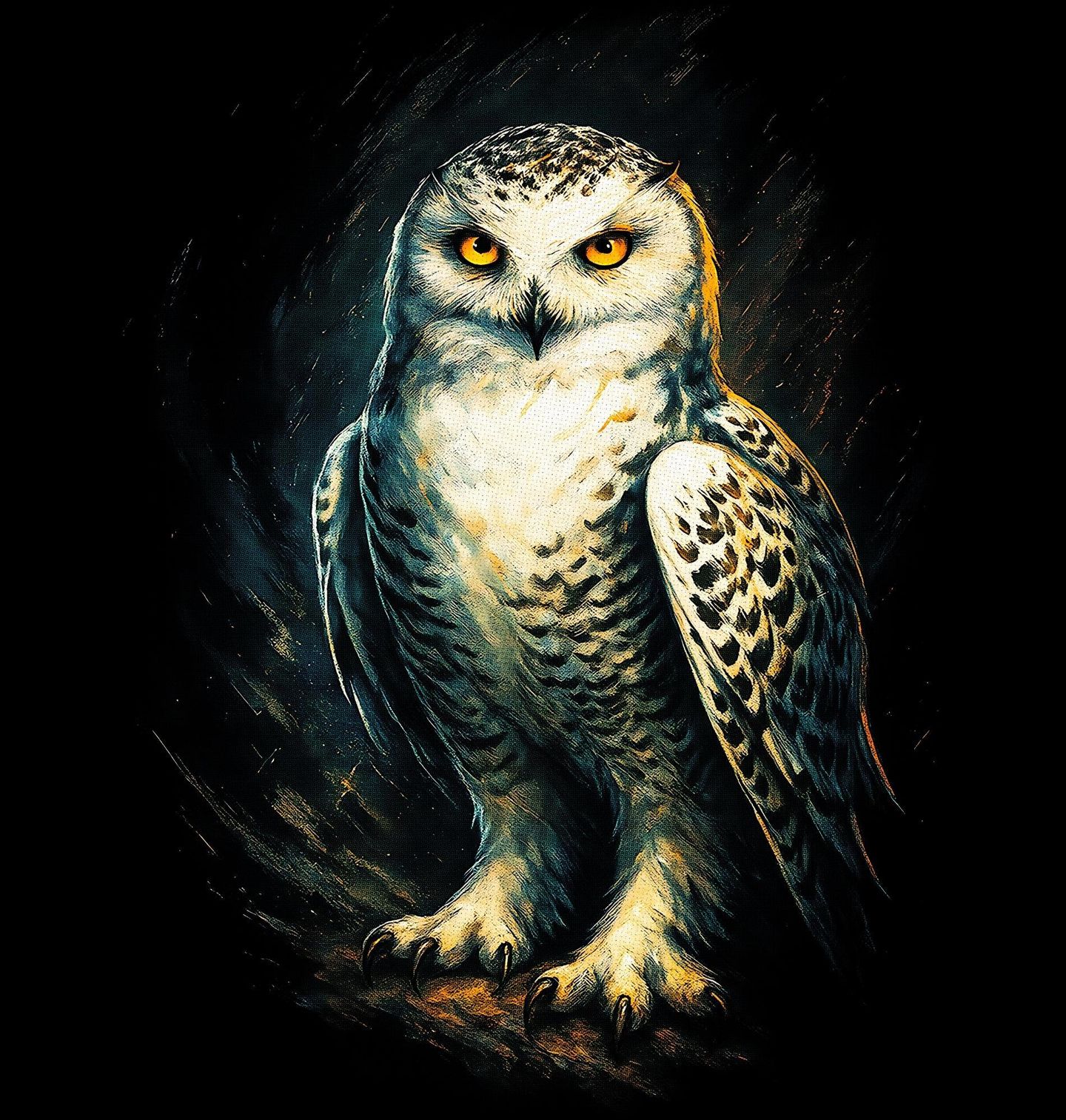 Dámské tričko Sovice sněžní. Sovice sněžná je denní lovec, výjimečný mezi sovami, a symbolizuje odolnost, nezávislost a schopnost přežít v extrémních podmínkách. V tomto uměleckém zpracování pták působí monumentálně a sebevědomě, s důrazem na detail peří, drápy a intenzivní pohled, který okamžitě přitáhne pozornost.