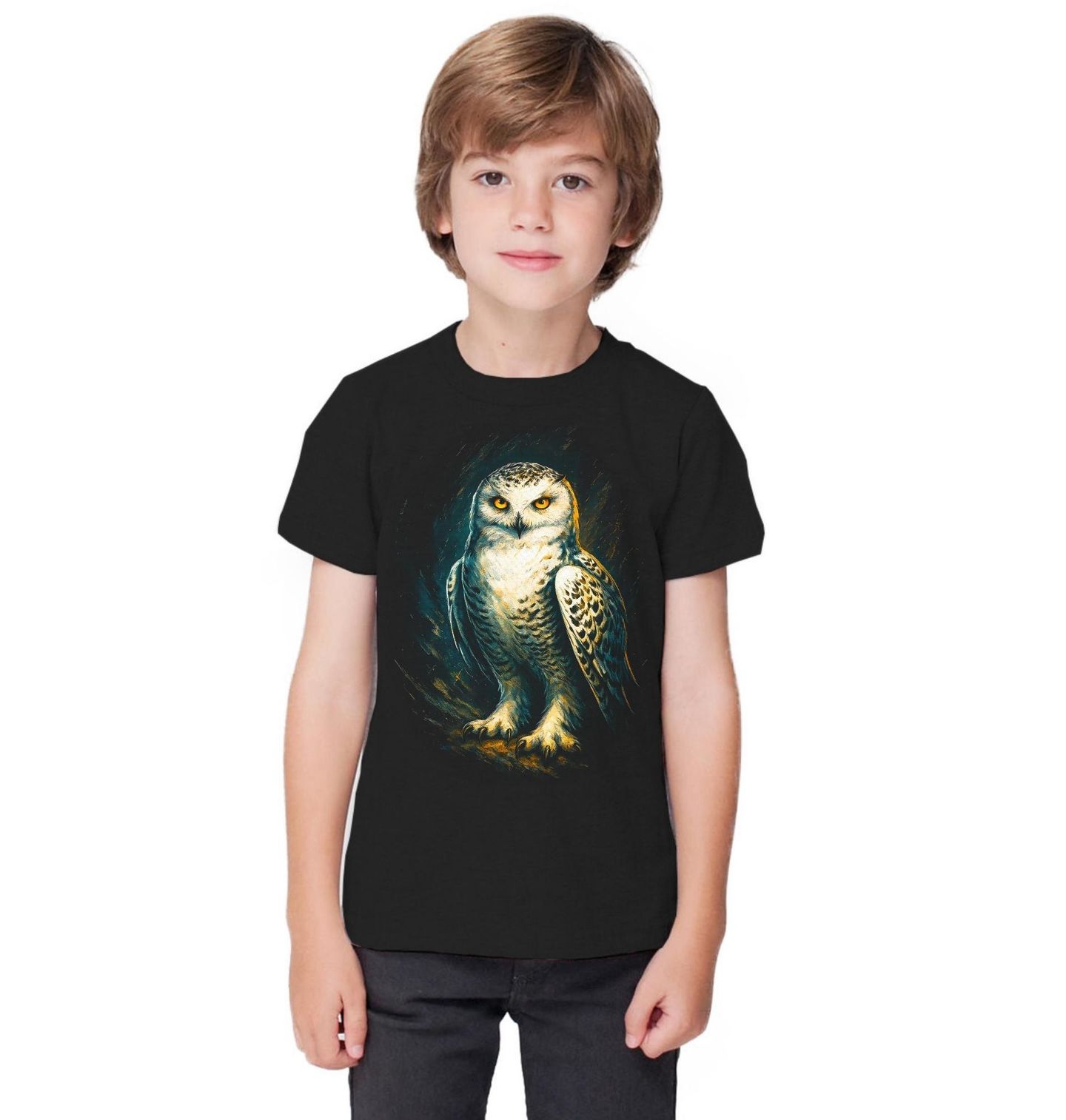 Dětské tričko Sovice sněžní. Sovice sněžná je denní lovec, výjimečný mezi sovami, a symbolizuje odolnost, nezávislost a schopnost přežít v extrémních podmínkách. V tomto uměleckém zpracování pták působí monumentálně a sebevědomě, s důrazem na detail peří, drápy a intenzivní pohled, který okamžitě přitáhne pozornost.