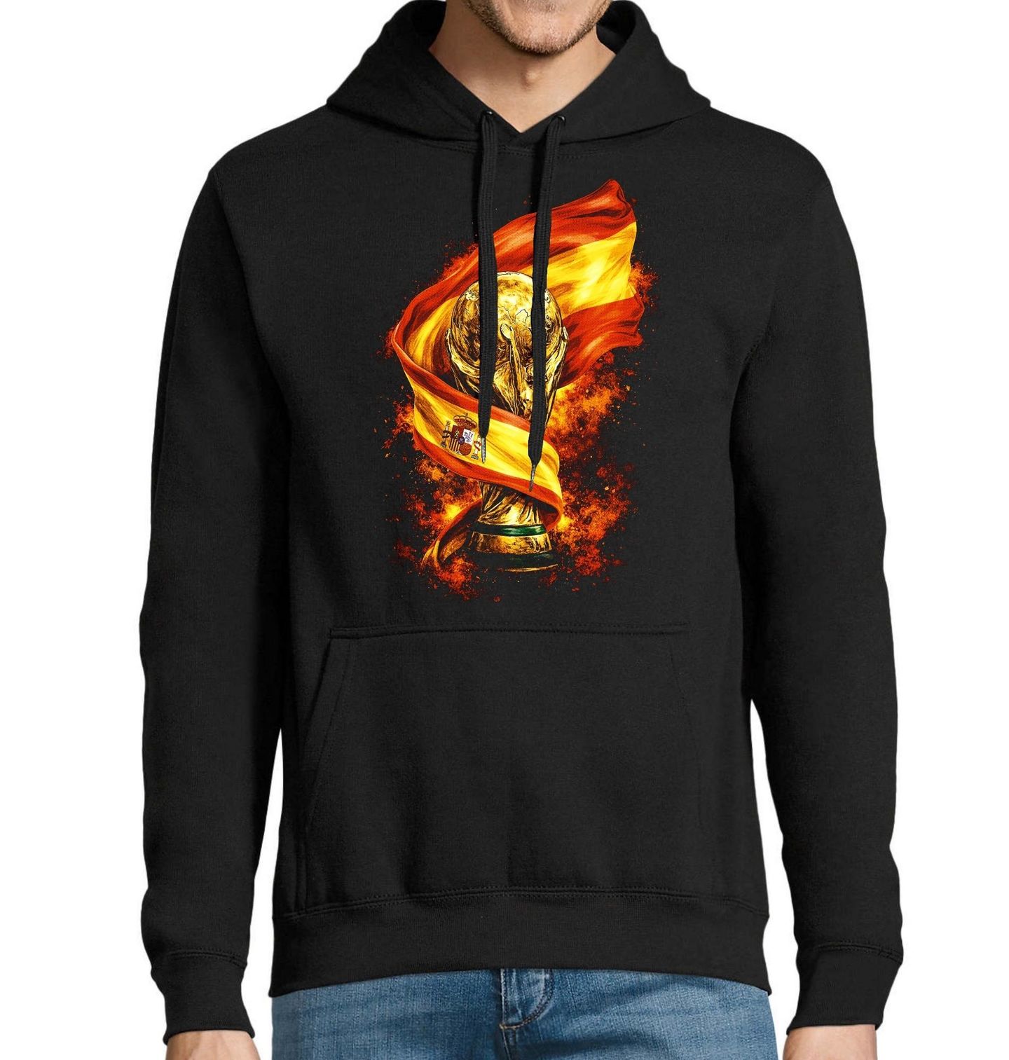 Pánská mikina Španělská Trofej FIFA World Cup. Dynamický a energický motiv zachycuje ikonickou trofej Mistrovství světa ve fotbale zahalenou do národní vlajky, která patří zemi Španělsko. Kombinace červené a žluté barvy spolu se zlatým pohárem symbolizuje vášeň, sílu a slavnou fotbalovou historii, kterou má Španělsko. Design evokuje atmosféru velkých vítězství, emocí a hrdosti na světové scéně.