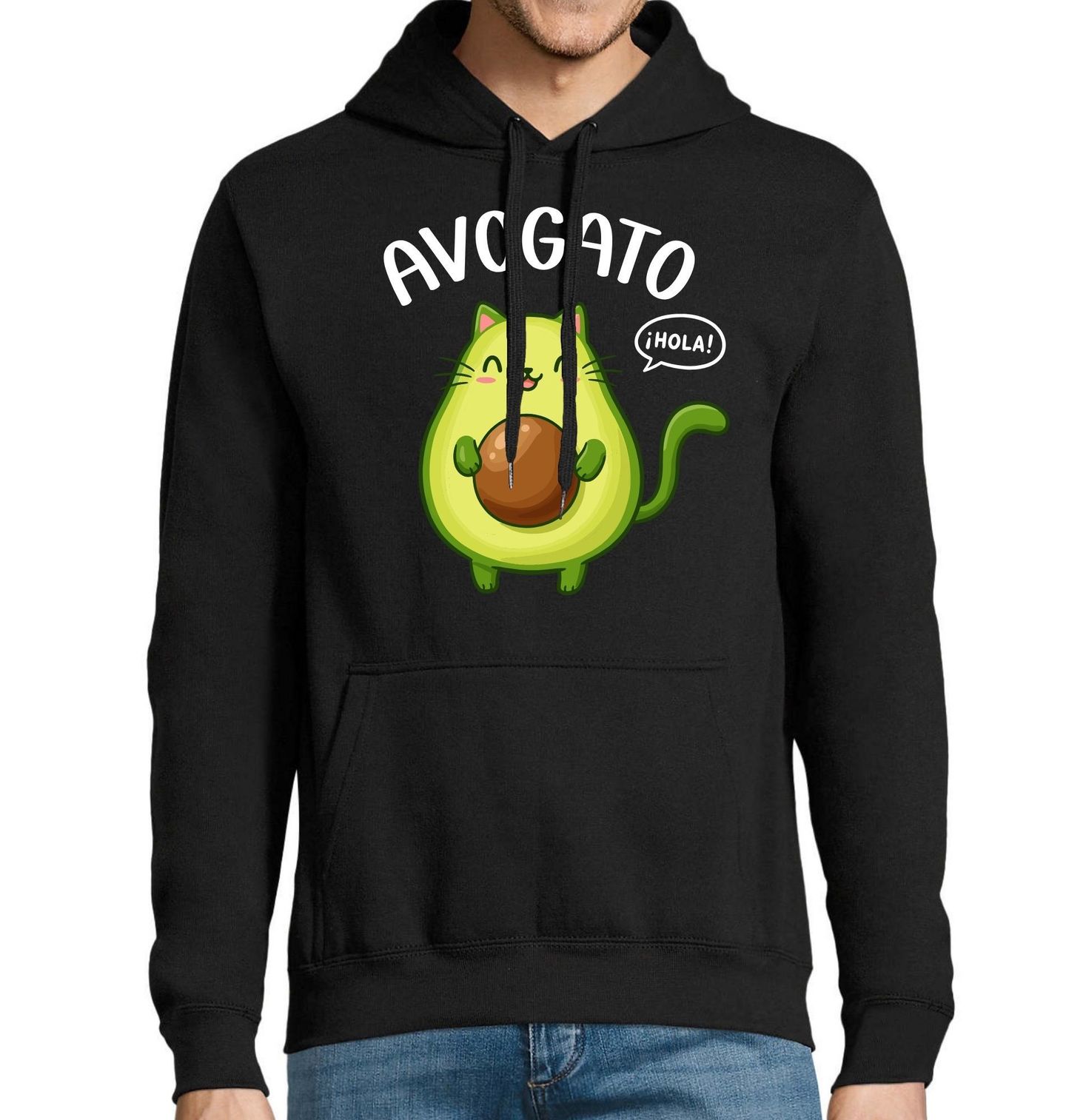 Pánská mikina Španělské Kočičí Avokádo Avogato. Vtipný a roztomilý motiv s nápisem „AVOGATO“, což je hravá slovní hříčka spojující slova avokádo a kočka. Design doplňuje kreslená postavička, kde kočka připomíná právě avokádo, a bublina s textem „¡HOLA!“, což znamená „Ahoj!“ ve španělštině. Tento originální motiv je ideální pro všechny milovníky zvířat i dobrého jídla.