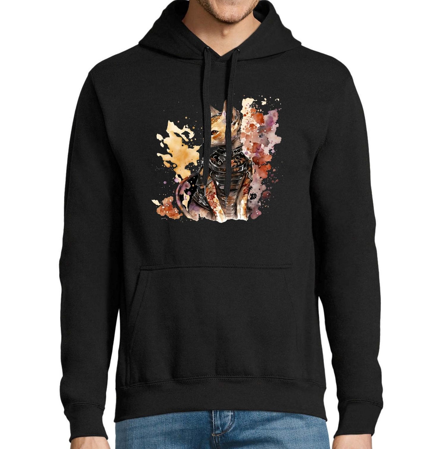 Pánská mikina Sphynx kočka Samuraj. Jemně stylizovaná kočka ve zbroji samuraje odpočívá s důstojným klidem, obklopená barvami připomínajícími podzimní listy Japonska. Tato sphynx kočka ztělesňuje odvahu, kulturu i eleganci bojovníka, kterého Japonsko vždy potřebovalo.