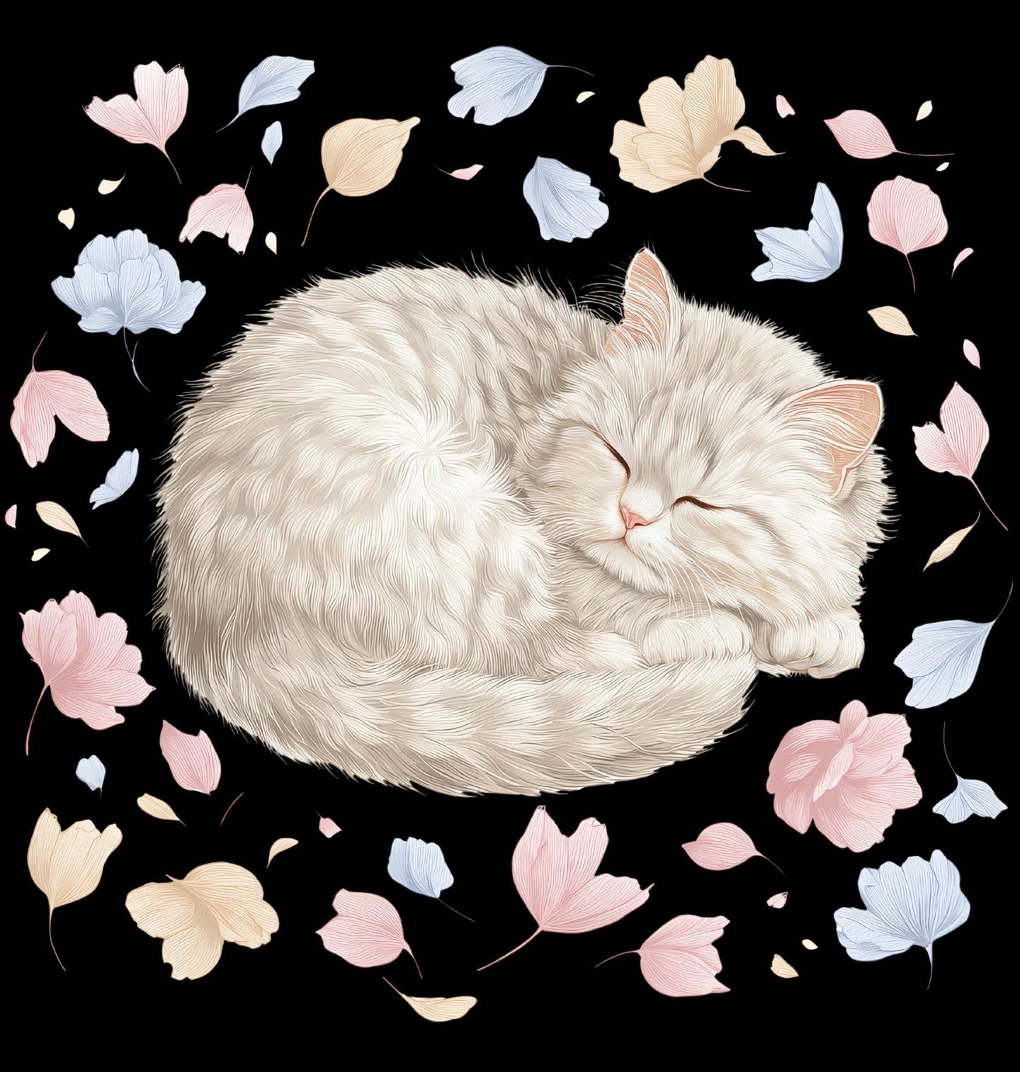 Dámské tričko Spící Bílá Kočka mezi Květy. Roztomilá kočka klidně odpočívající uprostřed jemných květin vyzařuje pohodu a něhu. Tento motiv spojuje krásu přírody a lásku ke zvířatům – kočka a květiny vytvářejí harmonickou scénu, která pohladí po duši každého milovníka roztomilosti, klidu a estetiky.