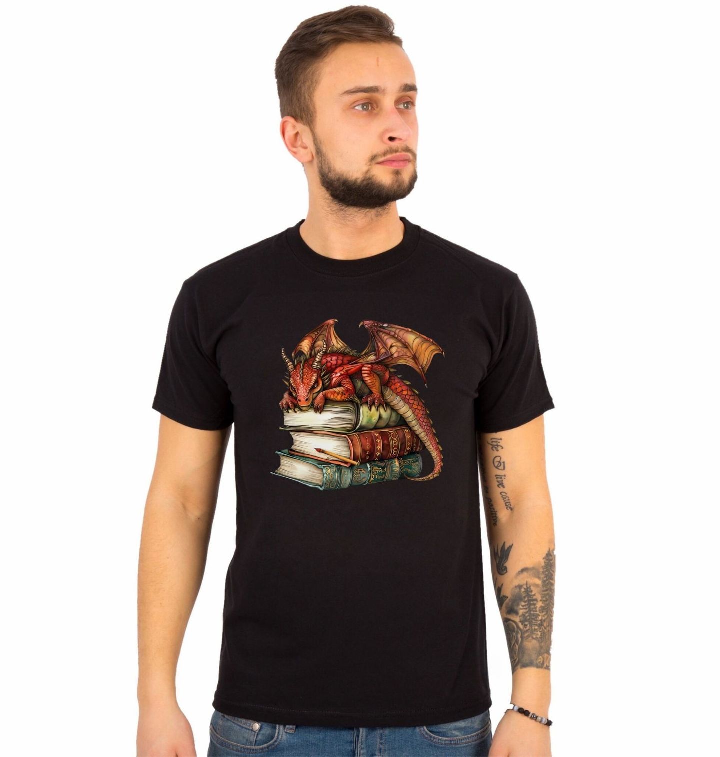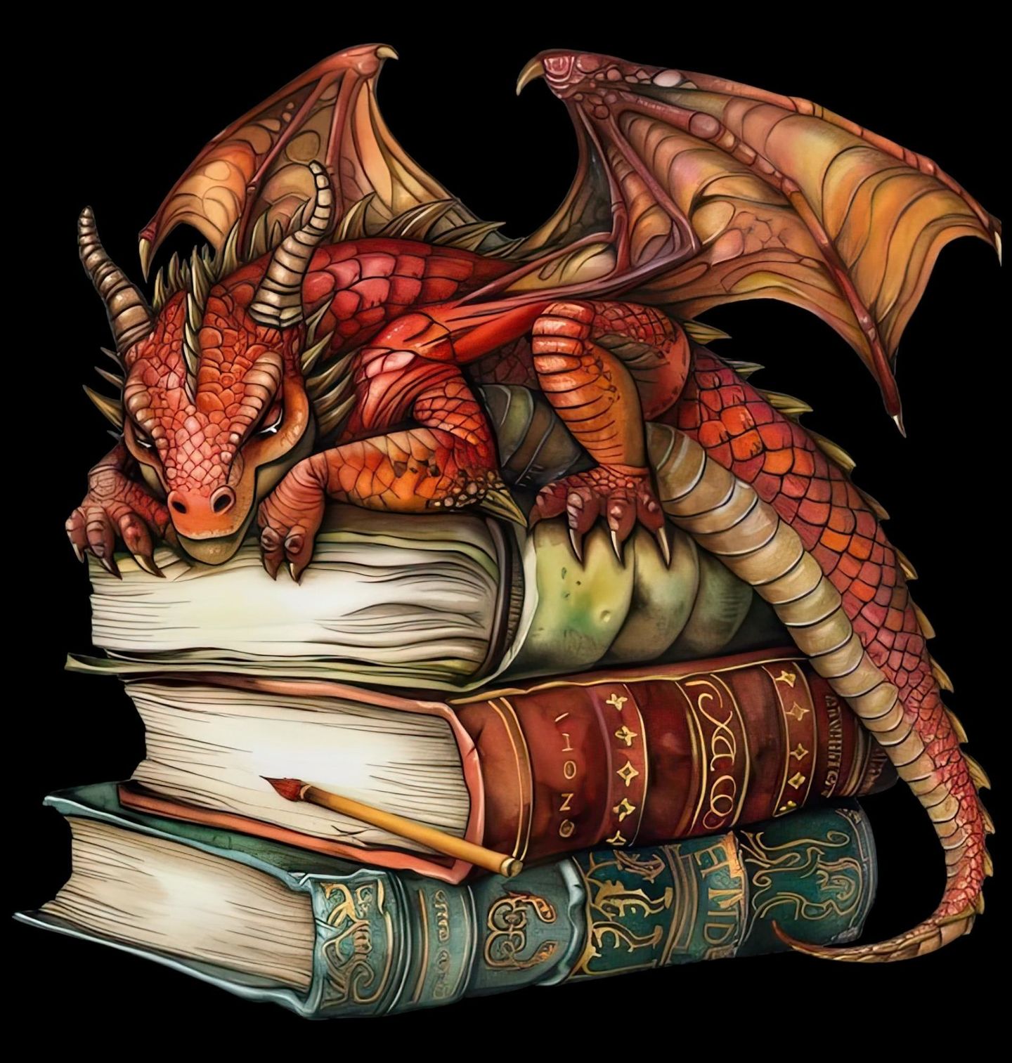 Pánské tričko Spící Červený Drak na Knihách. Okouzlující fantasy motiv, na kterém odpočívá malý červený drak na hromádce starých magických svazků. Starodávné knihy se zlatými hřbety a dobrodružná kniha pod ním vytvářejí tajemnou atmosféru plnou legend, kouzel a příběhů, které čekají na objevení. Ideální pro všechny, kdo milují fantasy svět, čtení, magii a roztomilé, ale zároveň hrdé bytosti.