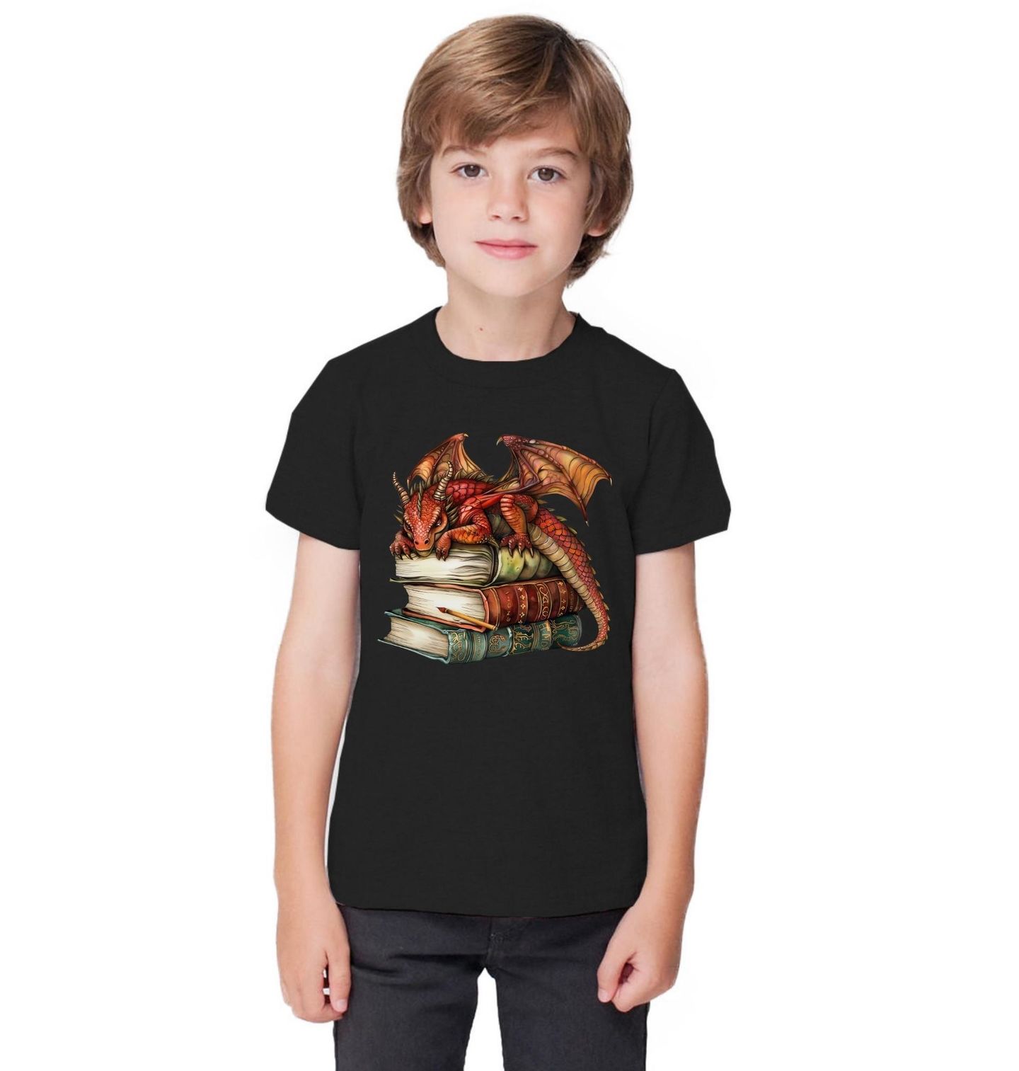 Dětské tričko Spící Červený Drak na Knihách. Okouzlující fantasy motiv, na kterém odpočívá malý červený drak na hromádce starých magických svazků. Starodávné knihy se zlatými hřbety a dobrodružná kniha pod ním vytvářejí tajemnou atmosféru plnou legend, kouzel a příběhů, které čekají na objevení. Ideální pro všechny, kdo milují fantasy svět, čtení, magii a roztomilé, ale zároveň hrdé bytosti.