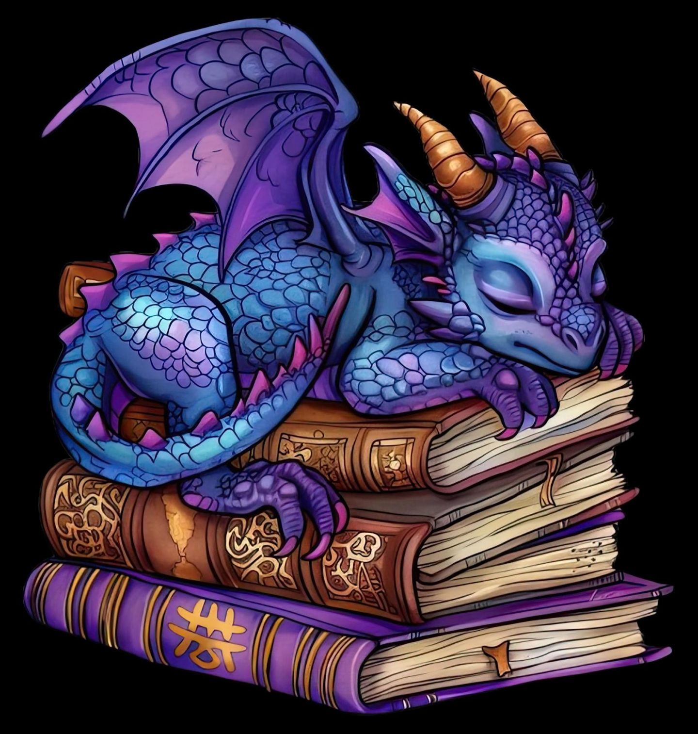 Pánské tričko Spící Fialový Drak na Knihách. Roztomilý modrofialový drak klidně usíná na hromádce starých kouzelných svazků. Oprýskané knihy s ozdobnými hřbety a tajemná kniha pod ním vytvářejí atmosféru plnou kouzel, pohody a dobrodružství. Tenhle motiv je jako z krásného fantasy příběhu — ideální pro knihomoly, milovníky draků i snílky, kteří věří na magii.