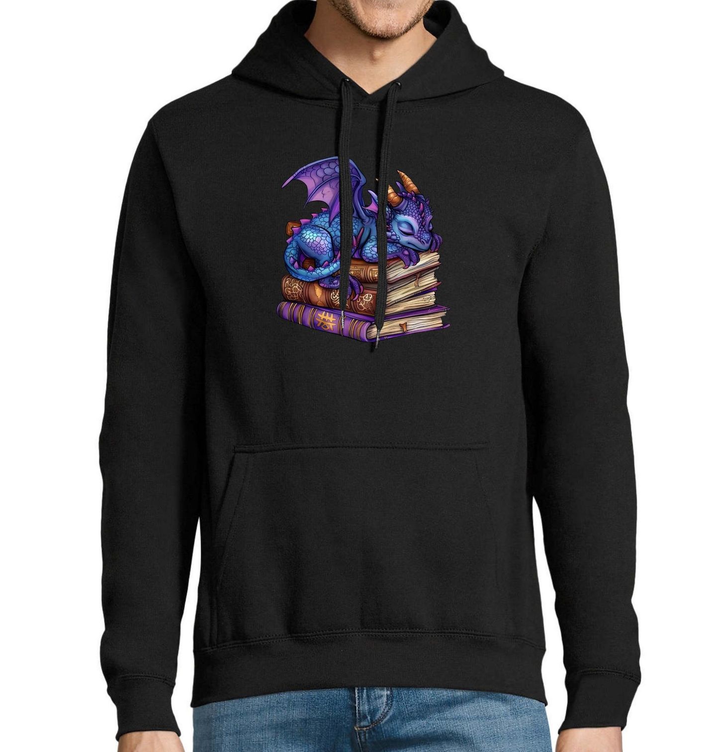 Pánská mikina Spící Fialový Drak na Knihách. Roztomilý modrofialový drak klidně usíná na hromádce starých kouzelných svazků. Oprýskané knihy s ozdobnými hřbety a tajemná kniha pod ním vytvářejí atmosféru plnou kouzel, pohody a dobrodružství. Tenhle motiv je jako z krásného fantasy příběhu — ideální pro knihomoly, milovníky draků i snílky, kteří věří na magii.