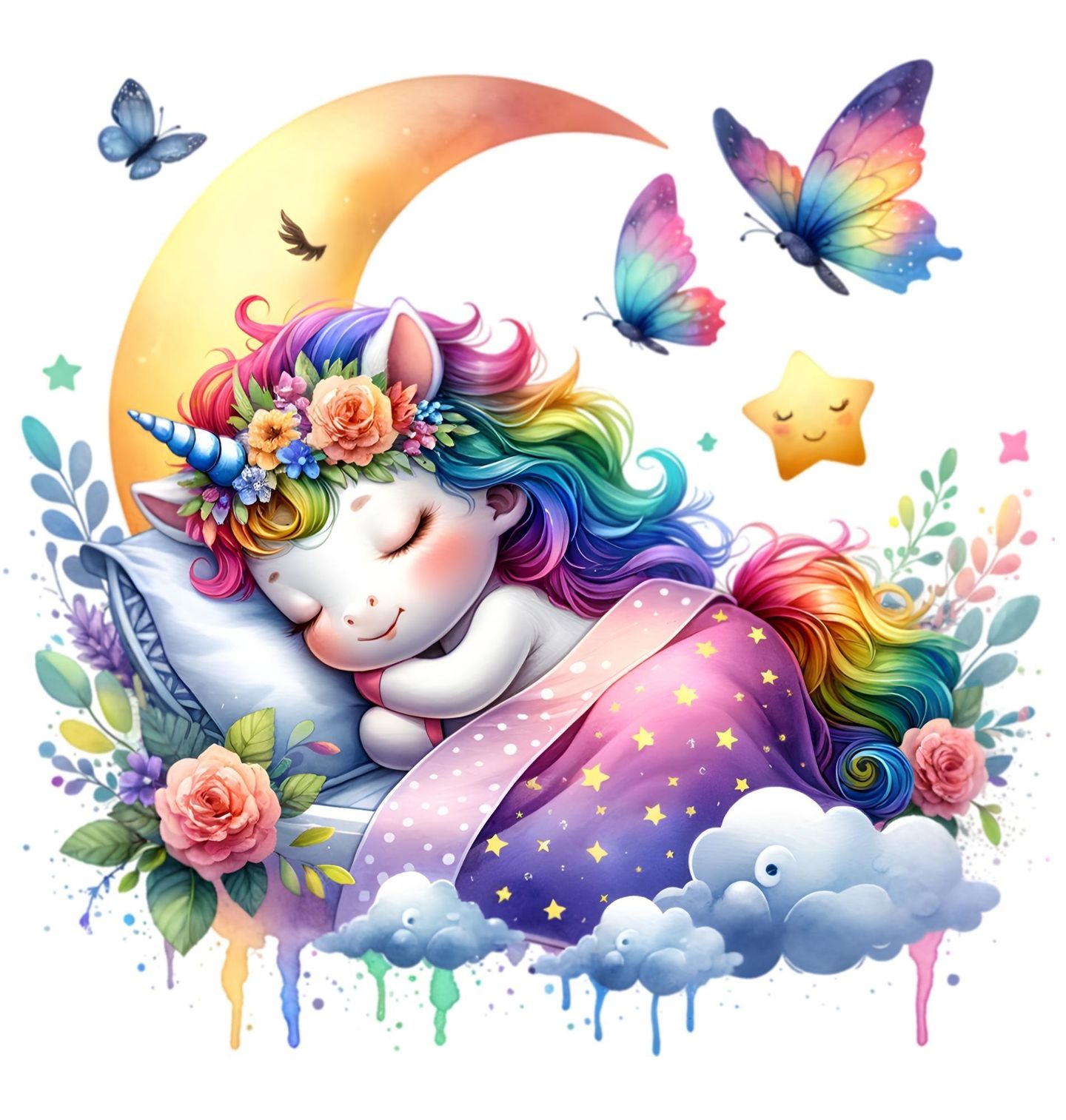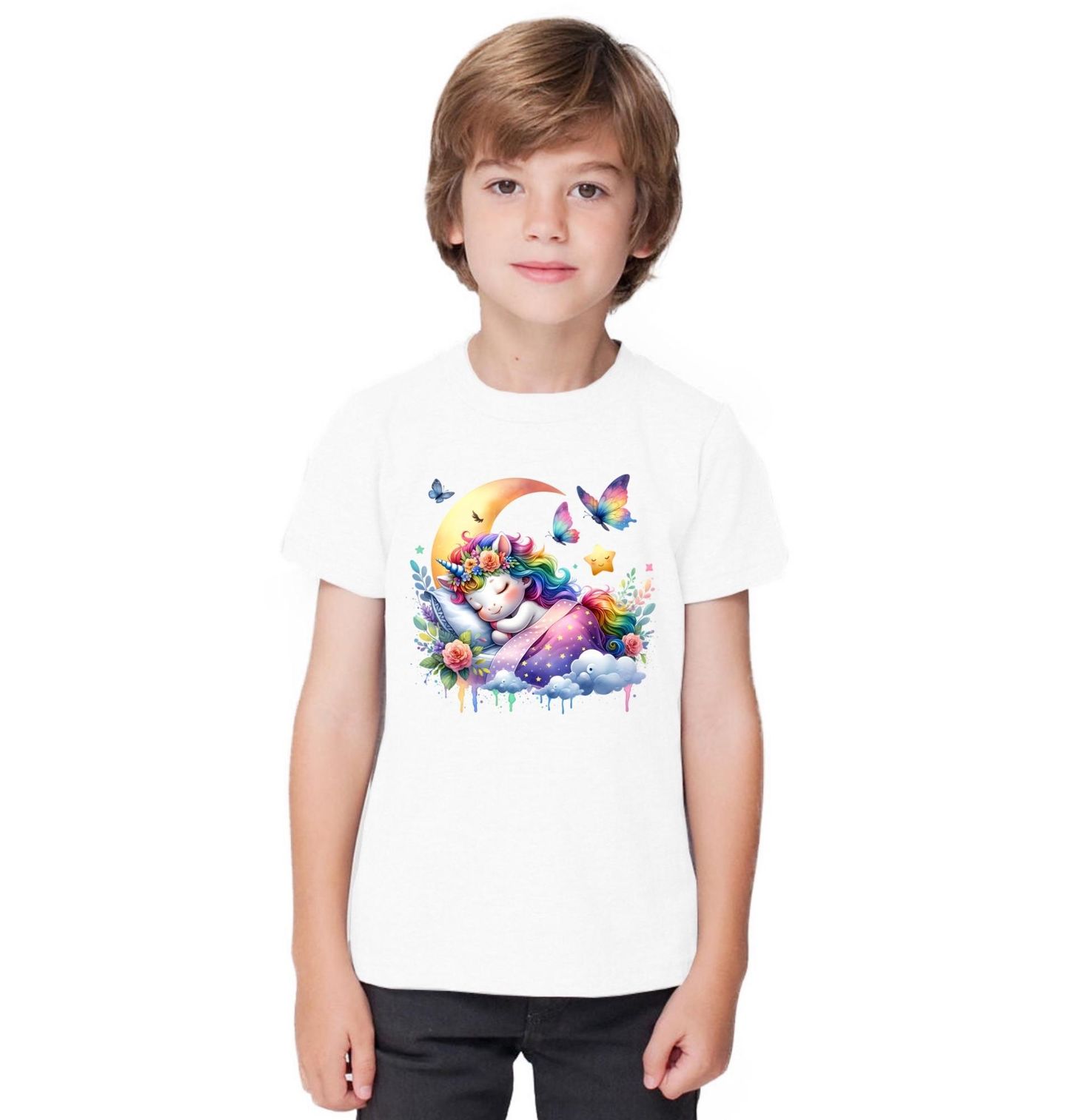 Dětské tričko Spící Jednorožec na Měsíci. Vneste do dětského světa jemnost, kouzlo a pohodu s tímto nádherným motivem, jehož hlavní postavou je jednorožec spící pod měsíčním svitem. Oblečený do duhových snů, obklopený motýlky, květinami, hvězdami a měsíčkem, působí tento design uklidňujícím a pohádkovým dojmem.