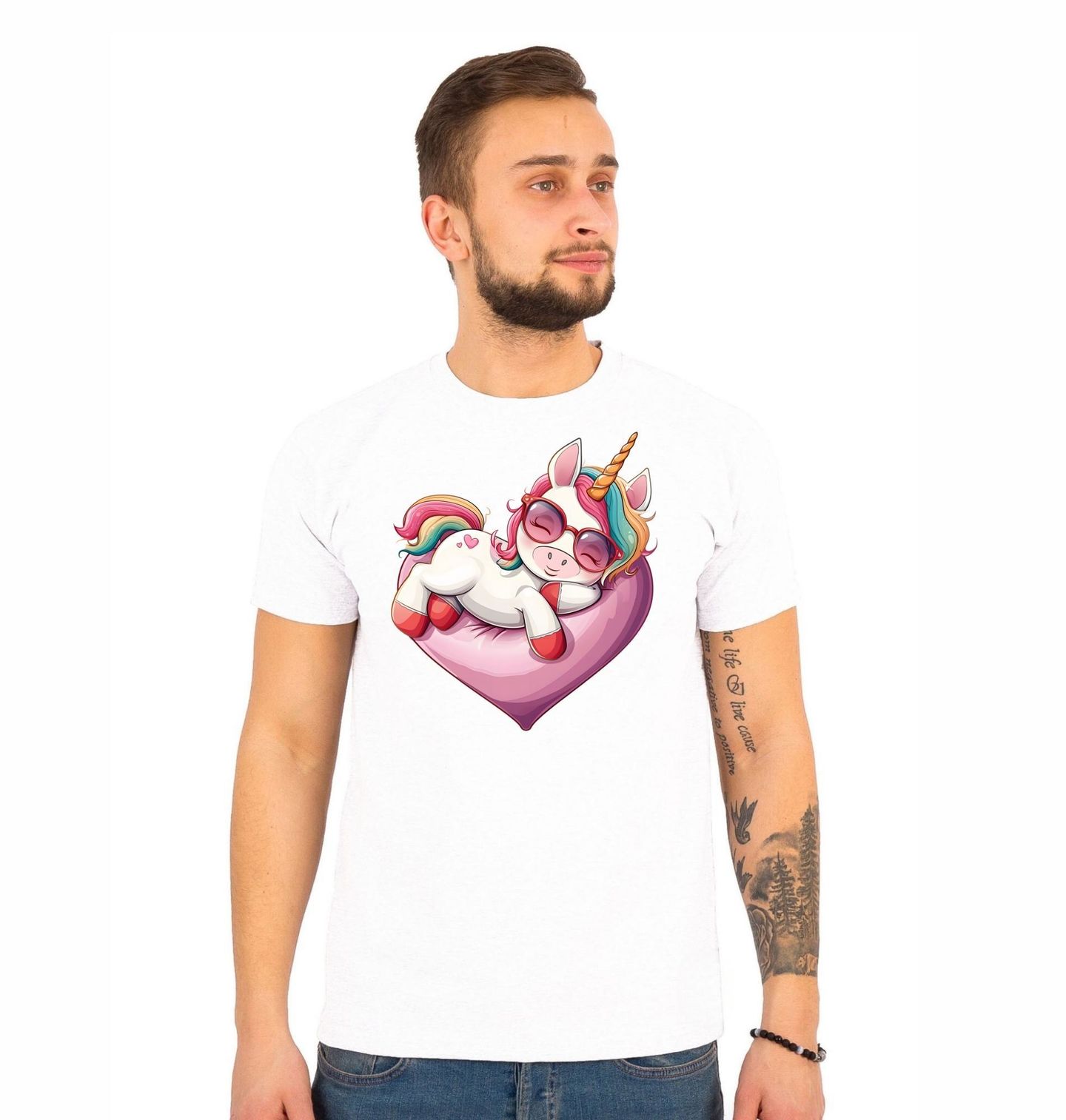 Pánské tričko Spící Jednorožec na Srdci. Roztomilý a hravý motiv, který si zamiluje každý milovník fantasy světa. Tento pohodový jednorožec odpočívající na měkkém srdce v barevných tónech působí klidně, šťastně a naprosto bezstarostně. Stylové sluneční brýle a duhová hříva dodávají designu moderní a cool vzhled.