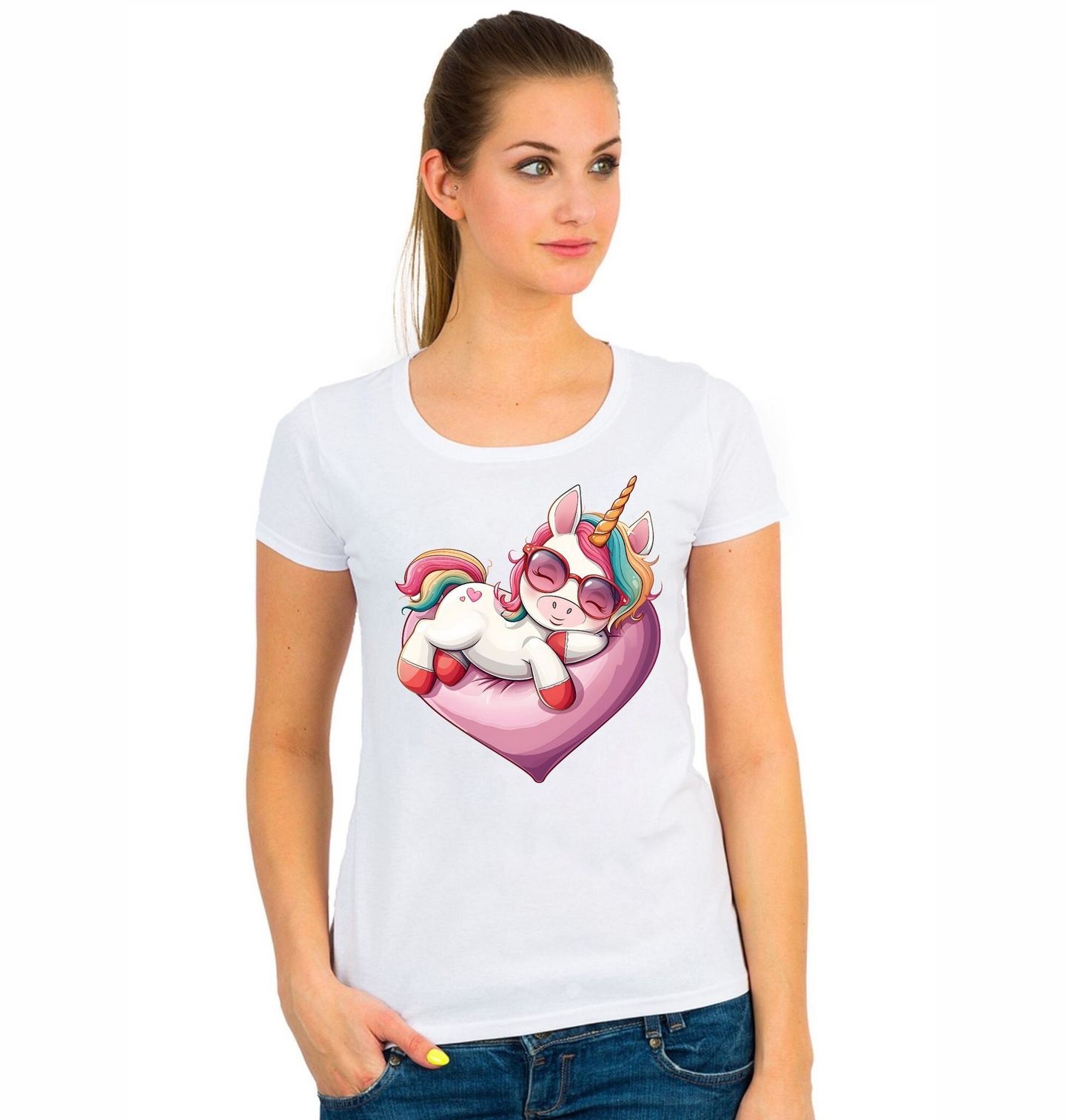 Dámské tričko Spící Jednorožec na Srdci. Roztomilý a hravý motiv, který si zamiluje každý milovník fantasy světa. Tento pohodový jednorožec odpočívající na měkkém srdce v barevných tónech působí klidně, šťastně a naprosto bezstarostně. Stylové sluneční brýle a duhová hříva dodávají designu moderní a cool vzhled.