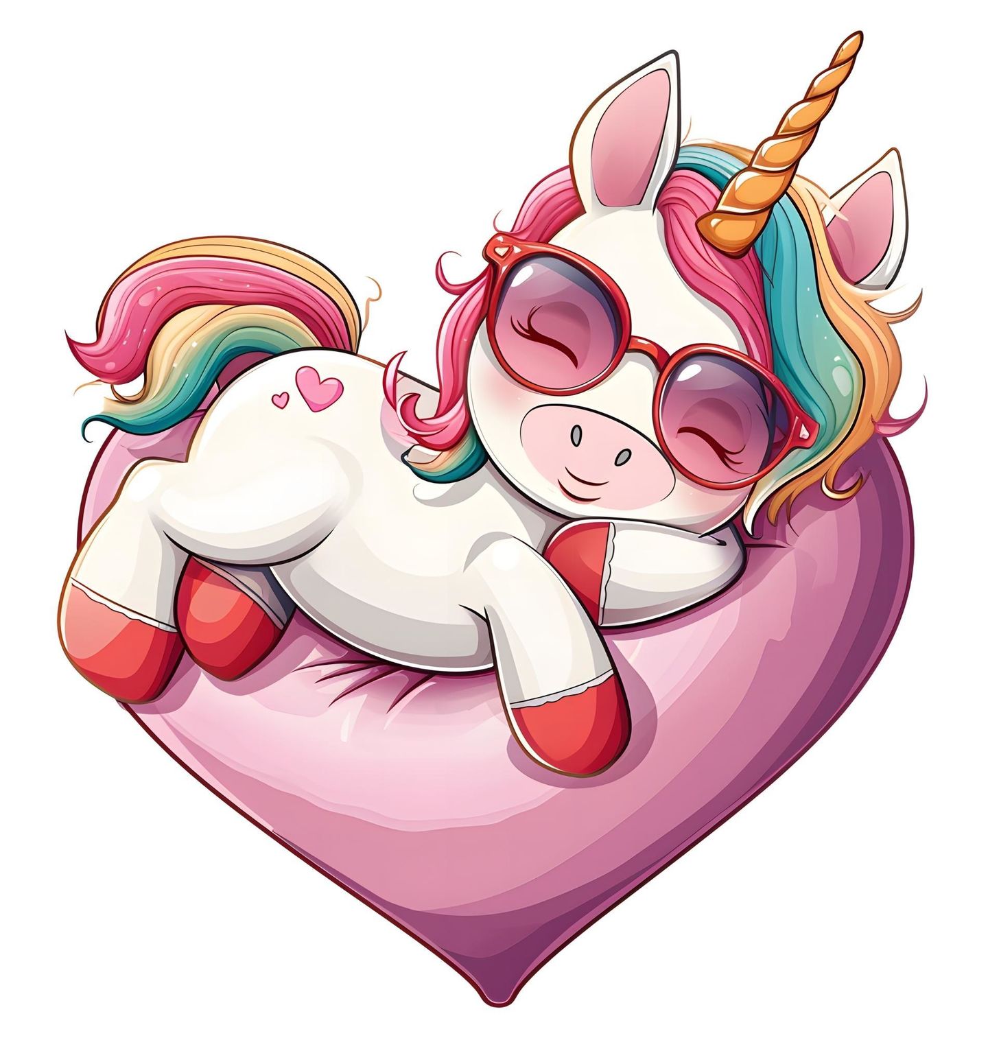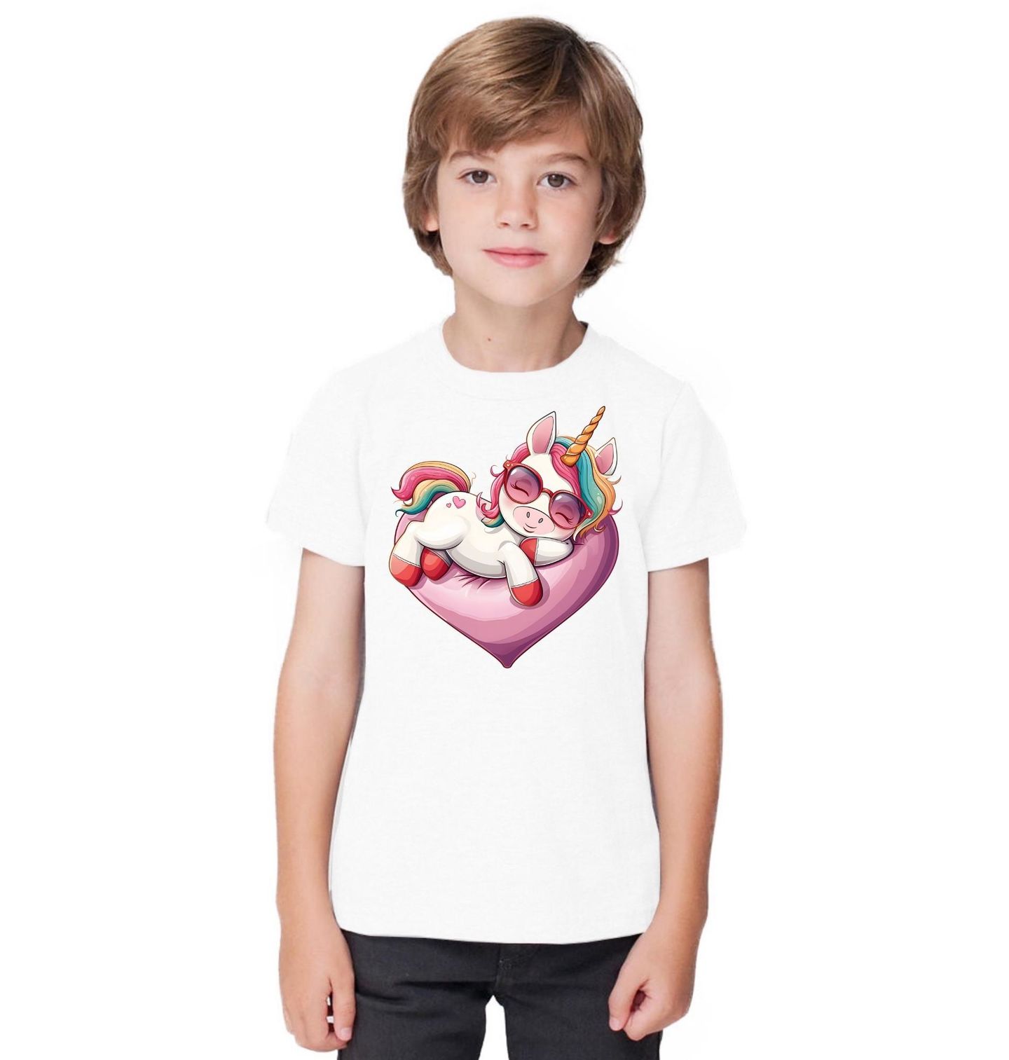 Dětské tričko Spící Jednorožec na Srdci. Roztomilý a hravý motiv, který si zamiluje každý milovník fantasy světa. Tento pohodový jednorožec odpočívající na měkkém srdce v barevných tónech působí klidně, šťastně a naprosto bezstarostně. Stylové sluneční brýle a duhová hříva dodávají designu moderní a cool vzhled.