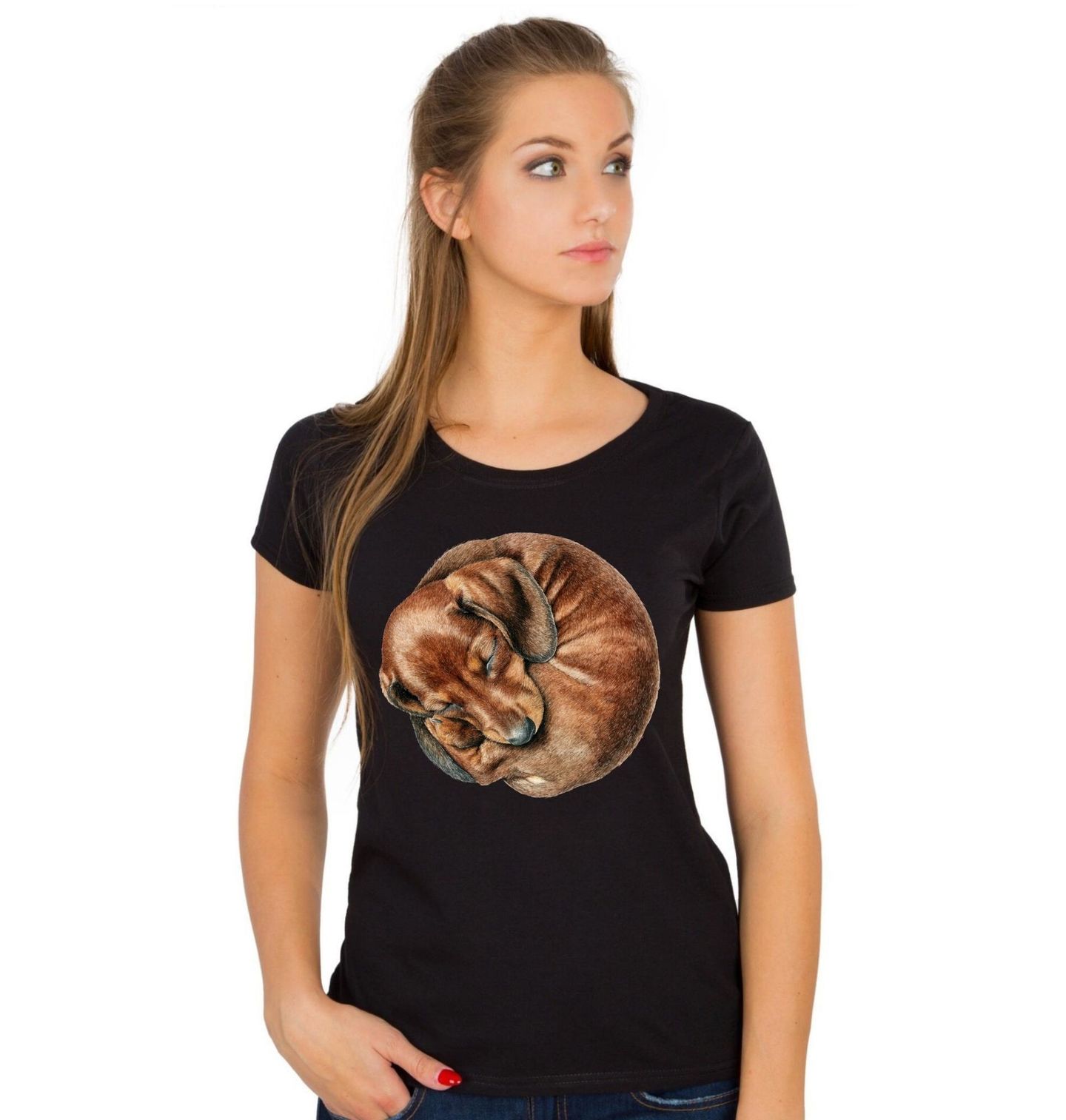 Dámské tričko Spící Jezevčík v Klubíčku. Tenhle pes je důkazem, že dokonalý klid existuje. Stočený do klubíčka, oči zavřené a svět může na chvíli počkat. Jezevčík v té nejčistší podobě – tichý, spokojený a úplně doma. Přesně ten pohled, který každý pejskař zná a miluje, když se dívá na svého parťáka a ví, že všechno je v pořádku.