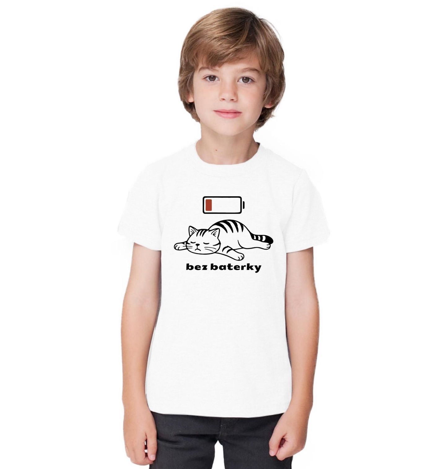Dětské tričko Spící Kočka Bez baterky. Tenhle motiv dokonale vystihuje stav, který zná každý milovník koček. Vybitá ikona baterie a spící mazlíček jasně říkají, že kočka si jede vlastní režim a když dojde energie, prostě se vypne. Ilustrace pobaví všechny, kdo vědí, že kočičí odpočinek je plnohodnotná činnost a že kočka si nabíjí baterky výhradně po svém.
