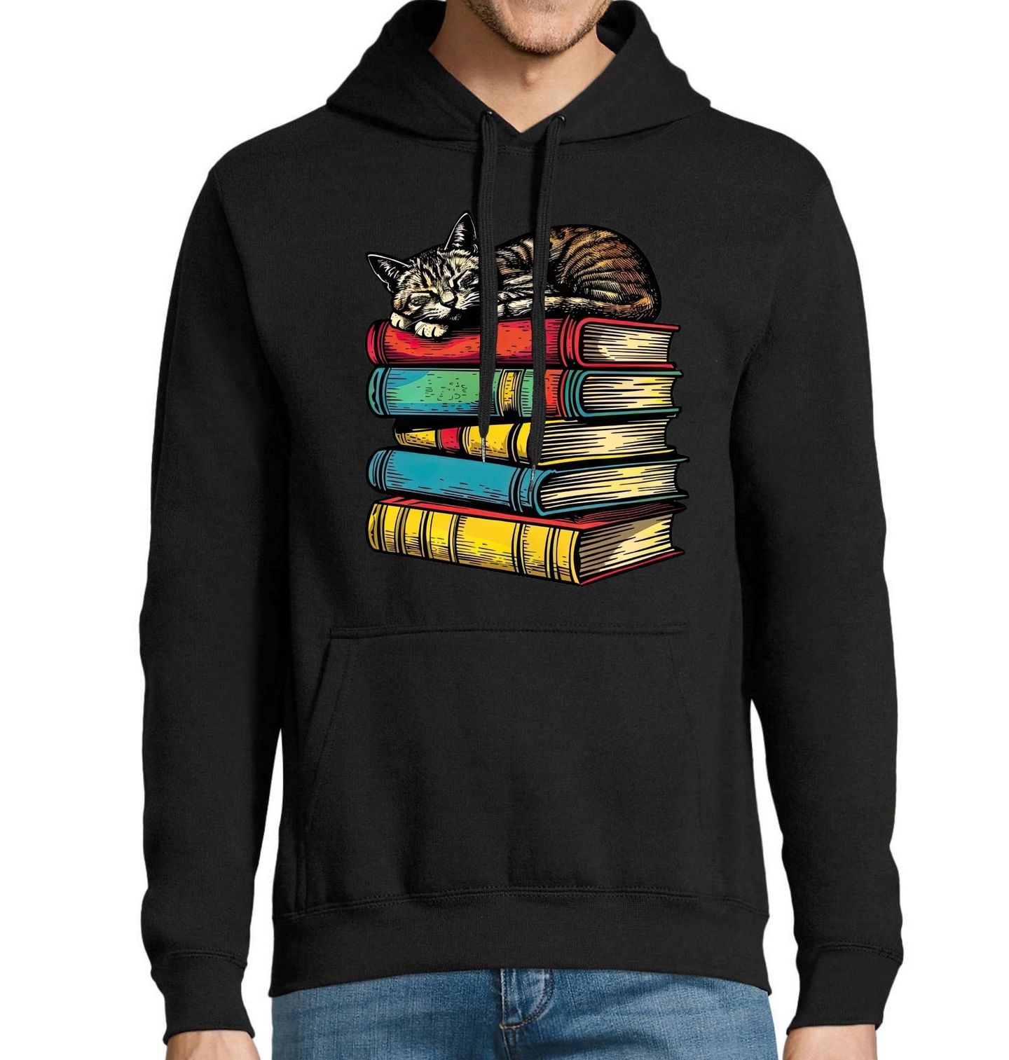 Pánská mikina Spící Kočka na Hromadě Knih. Ilustrace dokonale vystihuje atmosféru ticha, pohody a lásky ke čtení, kterou zná každý knihomil i milovník koček. Ideální design pro ty, kteří věří, že nejlepší společností ke knize je právě kočka. Skvělý dárek pro čtenáře, knihomoly a všechny, kdo si užívají čtení v klidném tempu.