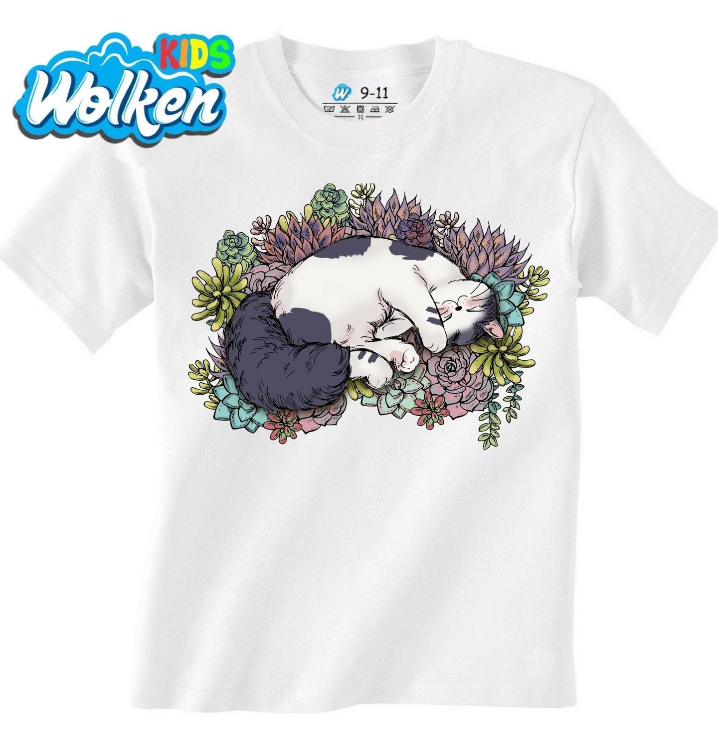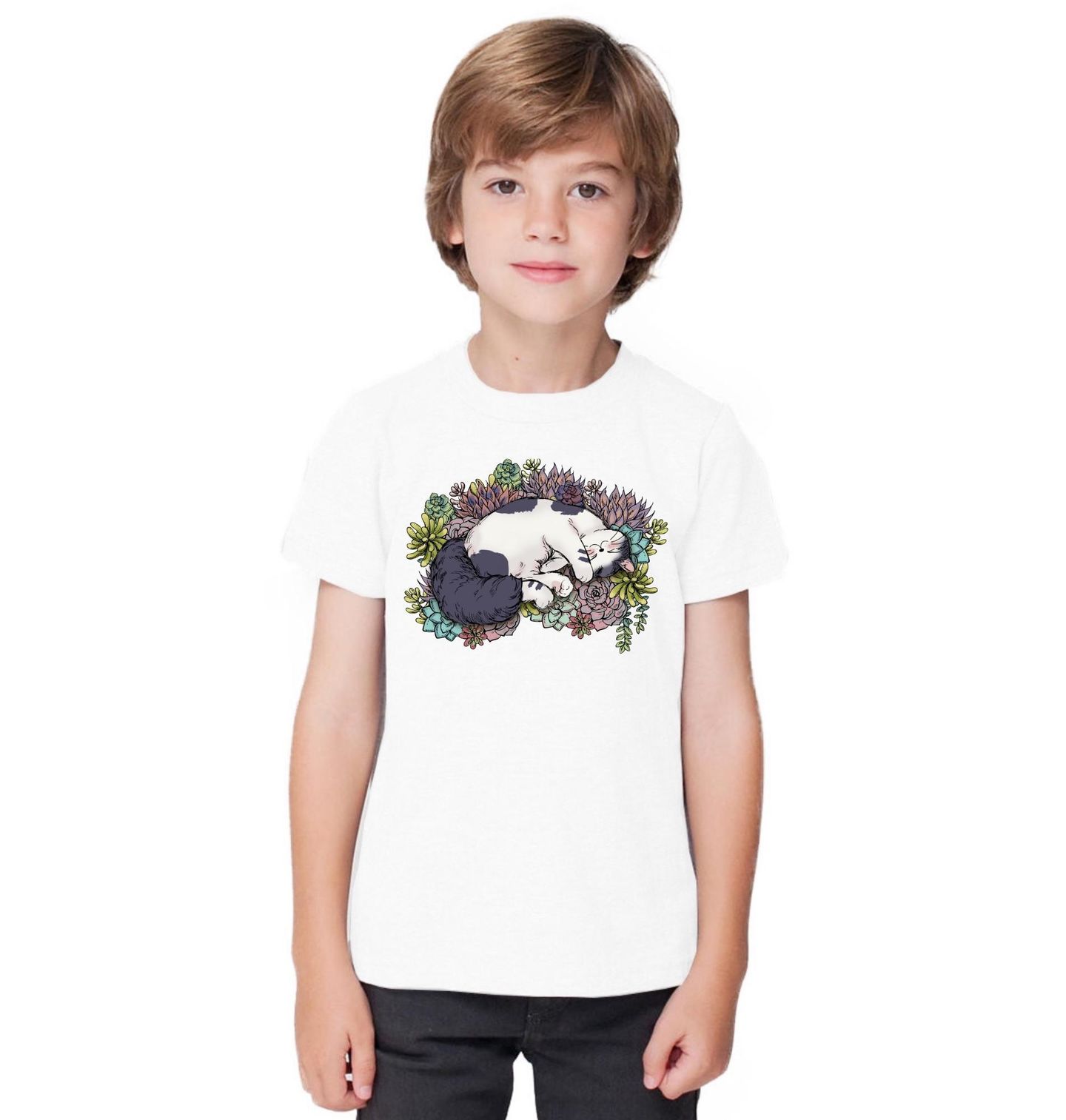 Dětské tričko Spící kočka na květinách. Spící kočka v objetí krásných květin. Jemné detaily a pastelové tóny vytvářejí harmonický a uklidňující design, který potěší každého milovníka koček a přírody. Skvělý dárek pro všechny, kteří milují kočky, rostliny a chvíle klidného snění.