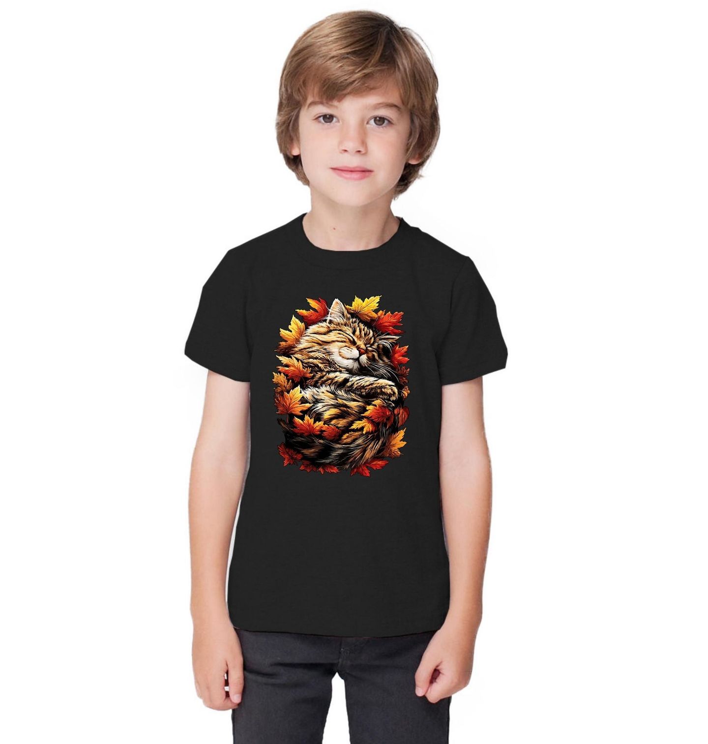 Dětské tričko Spící Kočka v Listí. Kočka je zbarvena do hnědých, rezavých a krémových odstínů a svým vzhledem připomíná mourovatou kočku s jemnou, delší srstí. Je stočená do klubíčka a obklopená barevným listí v tónech oranžové, žluté a červené, které dotváří hřejivou podzimní atmosféru.