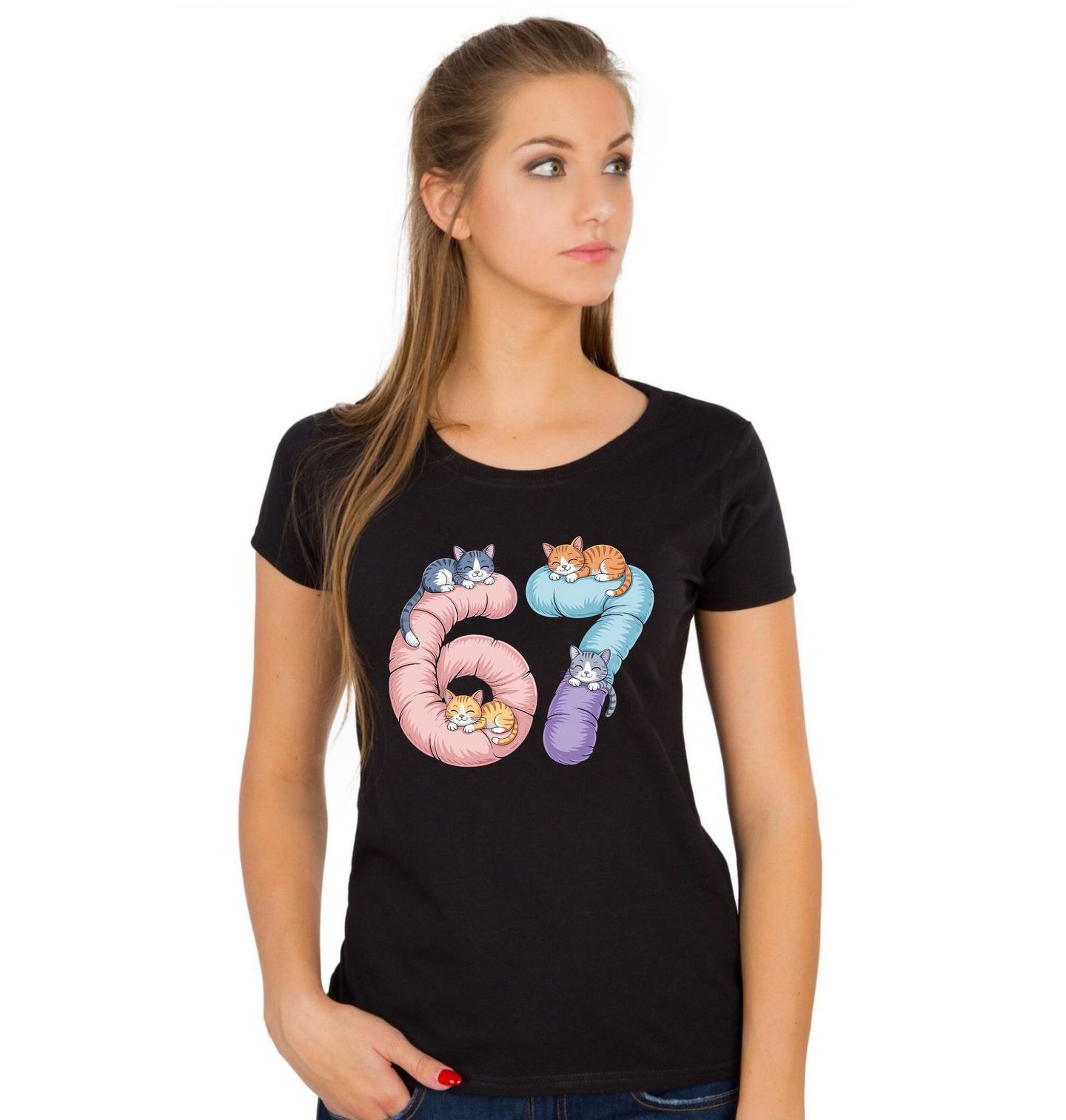 Dámské tričko Spící Kočky 67 Six Seven Meme. Hledáš něco ultra roztomilého? Tento design 67 spojuje čísla six seven s motivem spících mazlivých koček – každá kočka je schoulená přímo do tvaru čísla. Ideální pro fanoušky cute stylu, kteří milují i trochu internetové zábavy ve stylu meme.