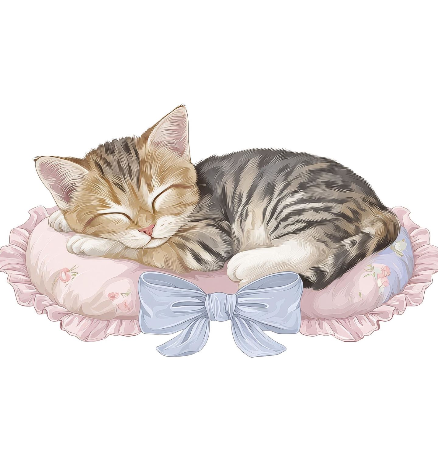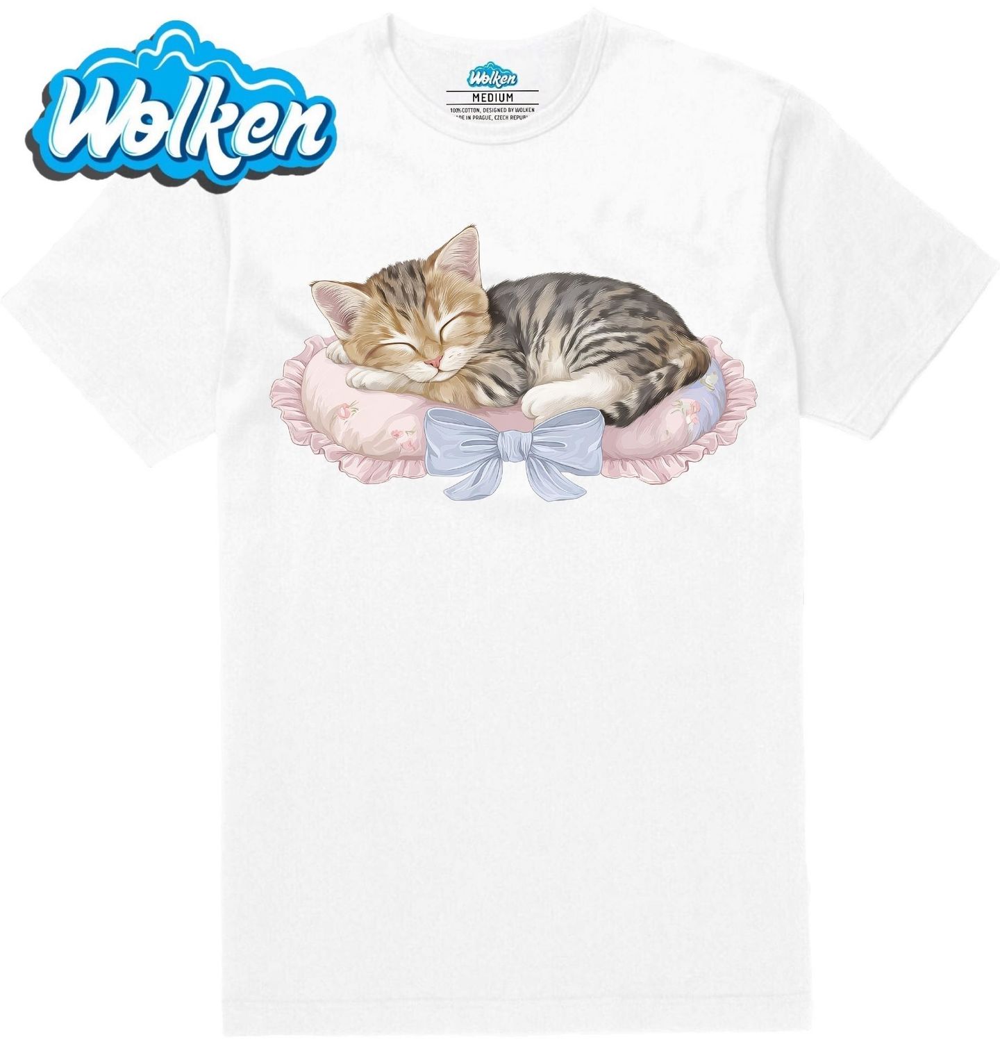 Pánské tričko Spící Kotě na Polštáři. Roztomilá kočka spící na měkkém polštáři s mašlí. Ideální motiv pro všechny milovníky koček, kteří chtějí přidat jemný a něžný design do svého šatníku. Motiv spící kočky potěší každého, kdo má rád roztomilé a jemné ilustrace domácích mazlíčků, a skvěle se hodí jako dárek pro přátele i rodinu.