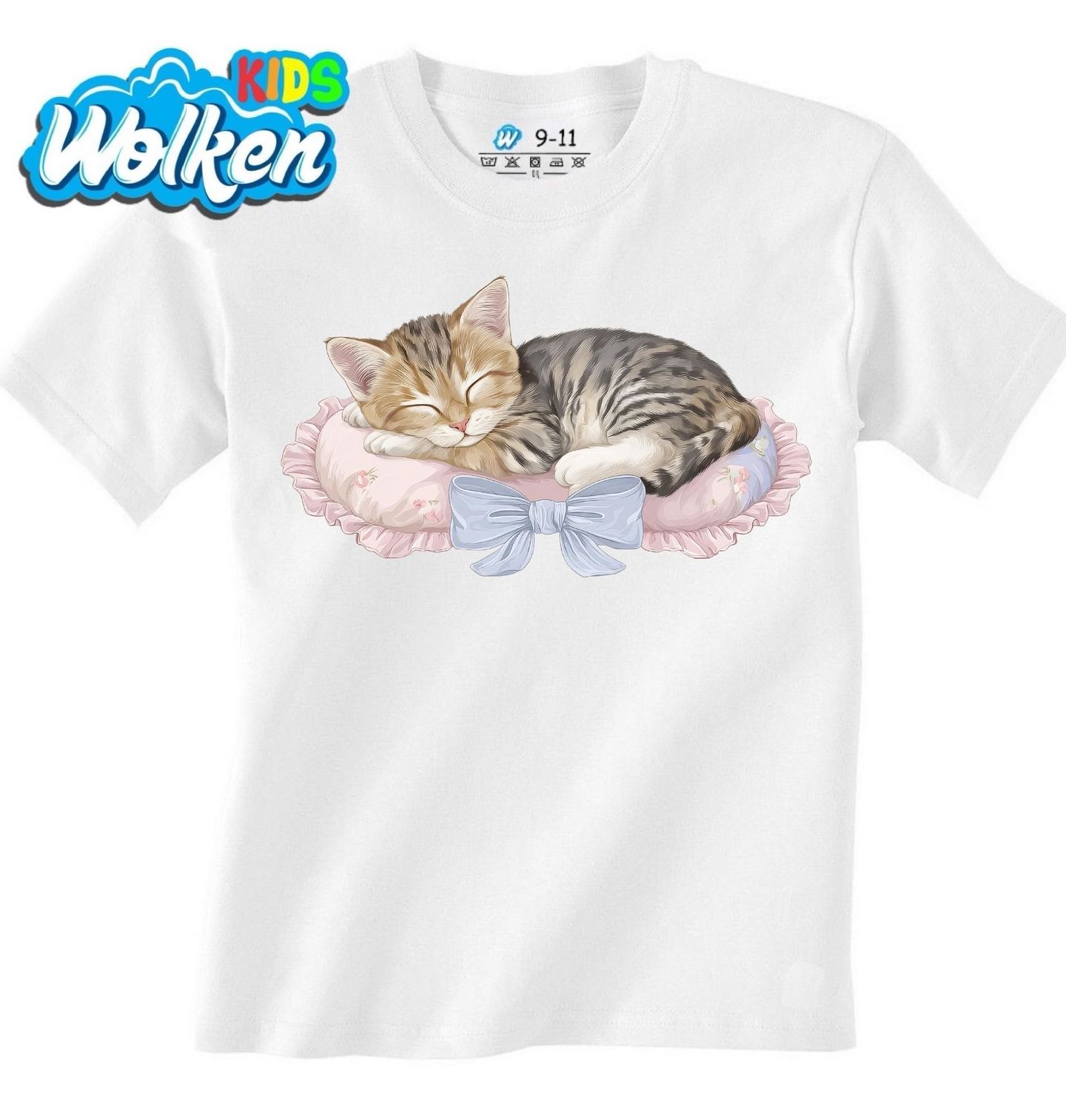 Dětské tričko Spící Kotě na Polštáři. Roztomilá kočka spící na měkkém polštáři s mašlí. Ideální motiv pro všechny milovníky koček, kteří chtějí přidat jemný a něžný design do svého šatníku. Motiv spící kočky potěší každého, kdo má rád roztomilé a jemné ilustrace domácích mazlíčků, a skvěle se hodí jako dárek pro přátele i rodinu.