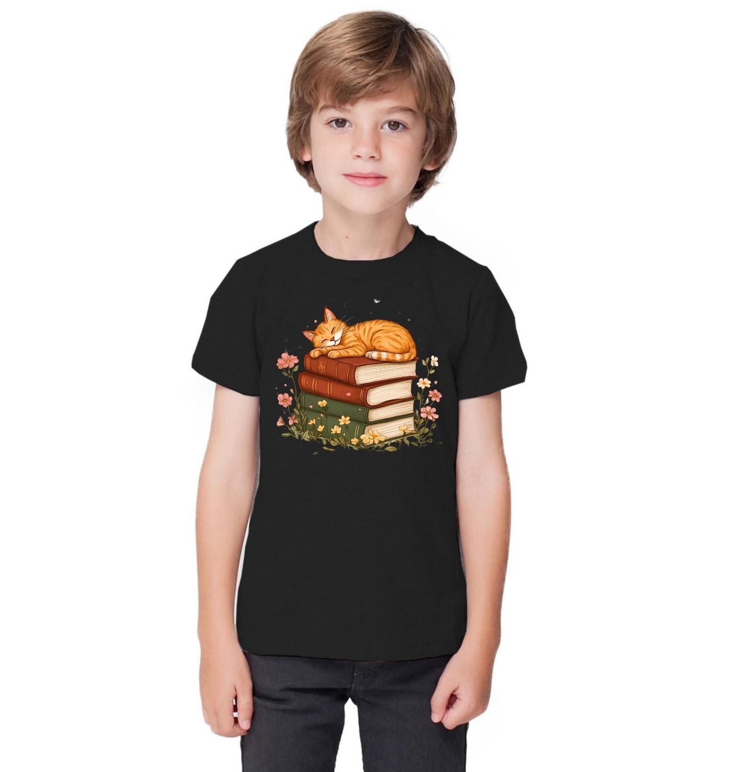 Dětské tričko Spící Oranžová Kočka na Knihách. Ilustrace zobrazuje spící kočku pohodlně uloženou na hromadě knih, obklopenou květinami, které dodávají celé scéně něžnou a harmonickou atmosféru. Kočka symbolizuje klid, pohodu a lásku k tichým chvílím, zatímco knihy představují svět fantazie a příběhů. Tento motiv osloví všechny milovníky čtení, relaxace a útulného prostředí.
