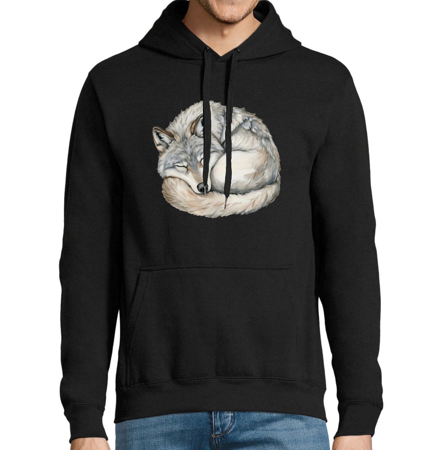 Pánská mikina Spící Vlk. Tento design zachycuje klidného vlka, který se spirálovitě stočil a spí v přírodě. S jemnými akvarelovými tóny a detaily, které ukazují vlčí klid a pohodu, tento motiv vyzařuje teplo, bezpečí a přirozený odpočinek.