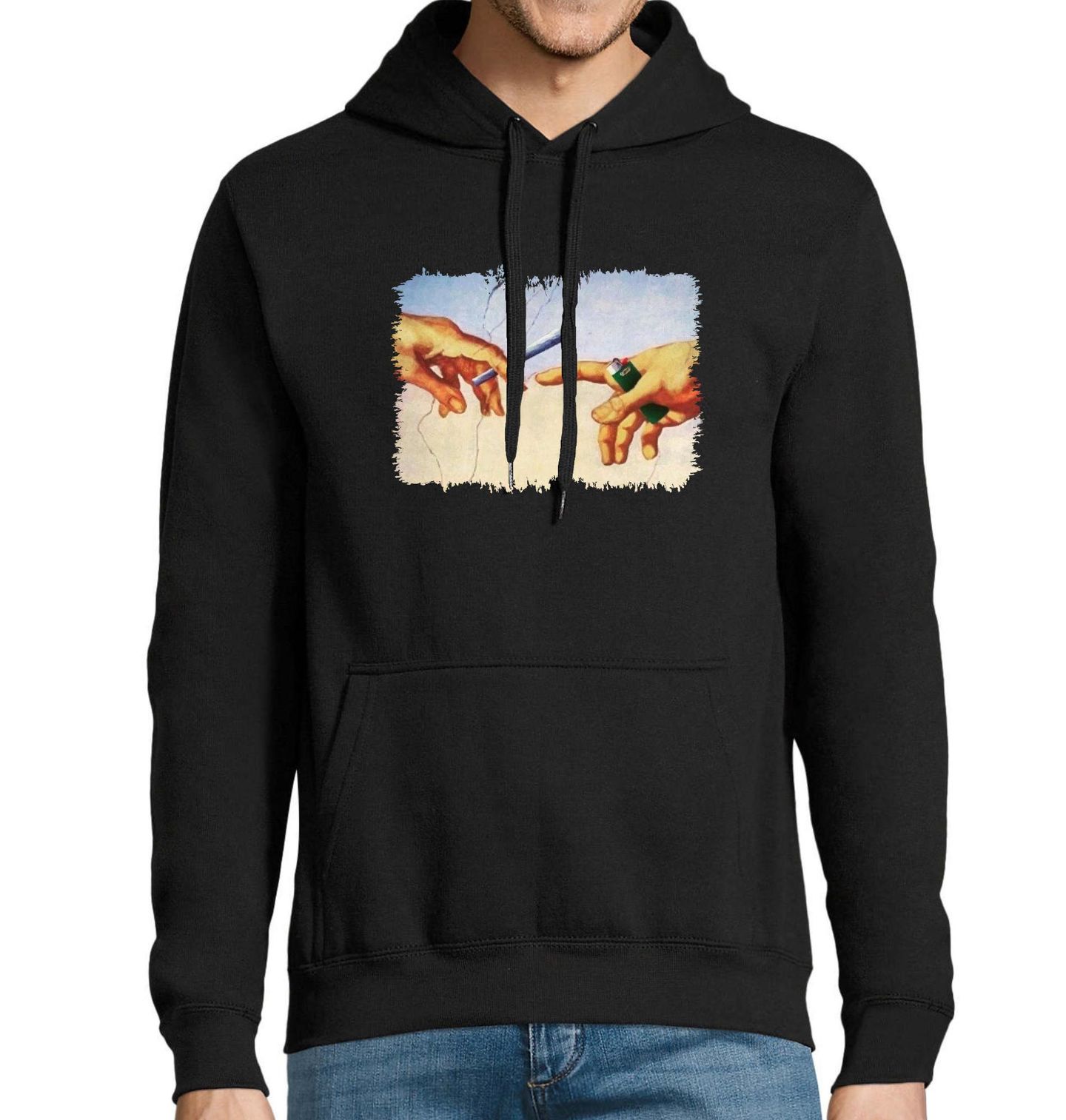 Pánská mikina Spojení Boha s Jointem. Tohle tričko je vtipnou parodií slavného renesančního díla Stvoření Adama od Michelangela, tentokrát však místo Boží jiskry přichází... zapalovač! Ideální pro milovníky humoru, kultury a samozřejmě – joint, tráva, marihuana. Spojení klasiky a chill životního stylu, které si prostě zamiluješ.