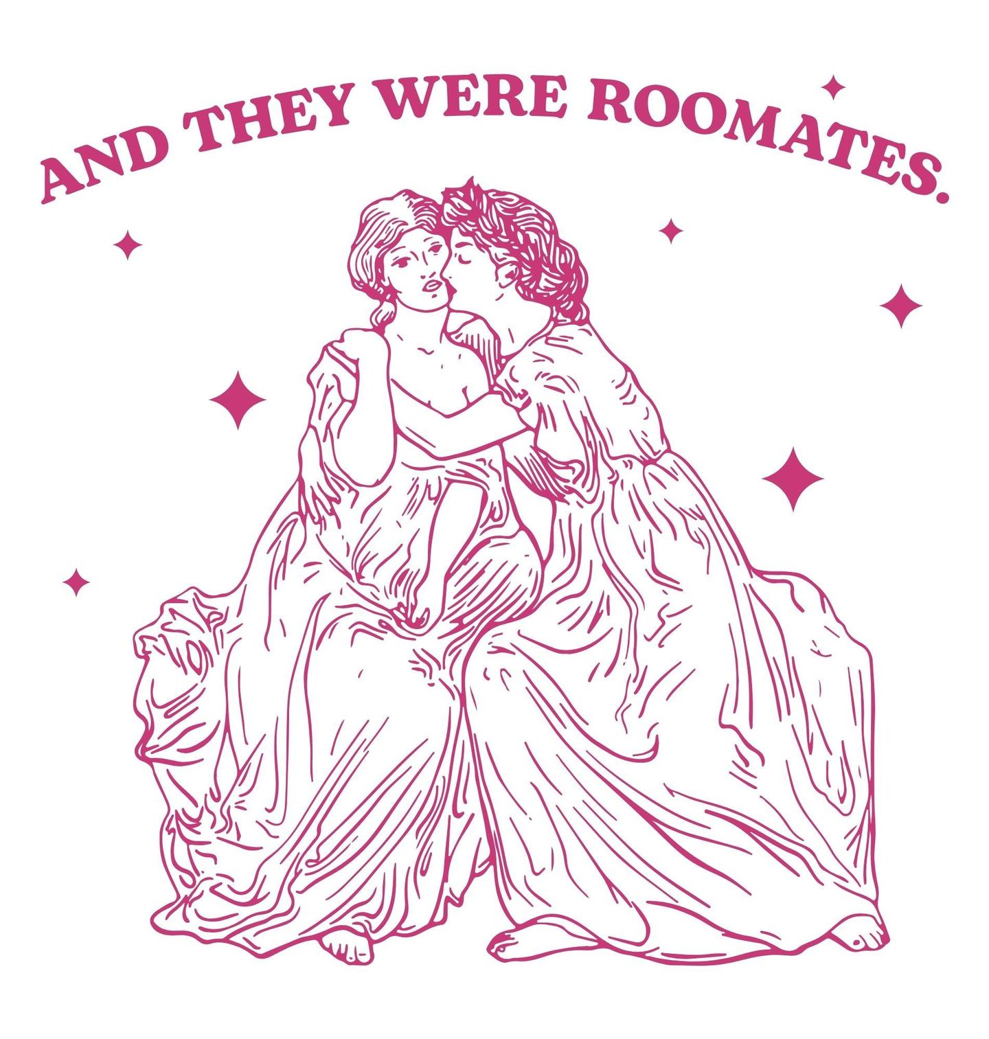 Pánské tričko Spolubydlící Roomates. Vintage ilustrace dvou objímajících se žen s textem „And they were roommates“ (A byli spolubydlící). Růžový motiv evokuje romantiku i humor. Design je ideální pro fanoušky retro stylu.