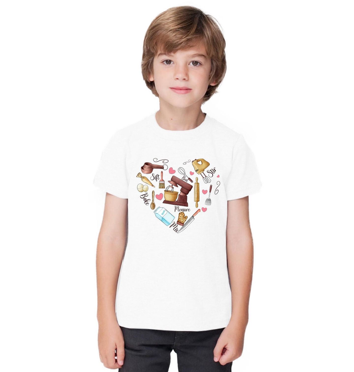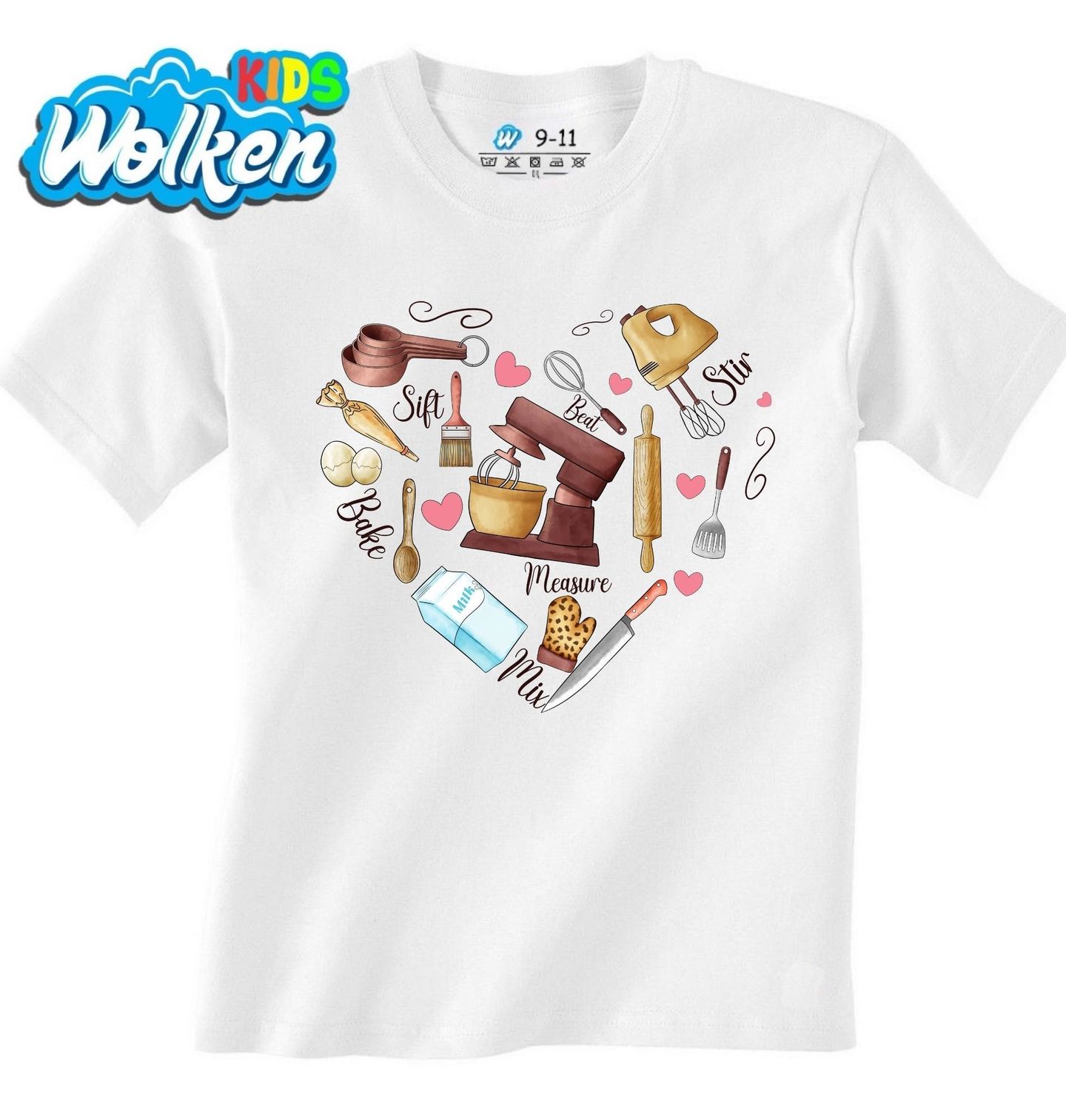 Dětské tričko Srdce Cukrářky. Tento originální motiv je ideální pro každého milovníka pečení! Všechny ilustrace – od mixéru, metliček, vařeček až po měrky a suroviny – jsou kreativně uspořádány do tvaru srdce, které vyjadřuje vášeň pro pečení. Nápisy jako Bake, Mix, Stir, Measure, Beat, Sift dodávají motivu styl a hravost.