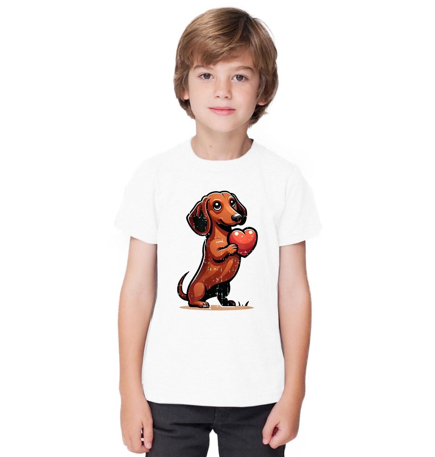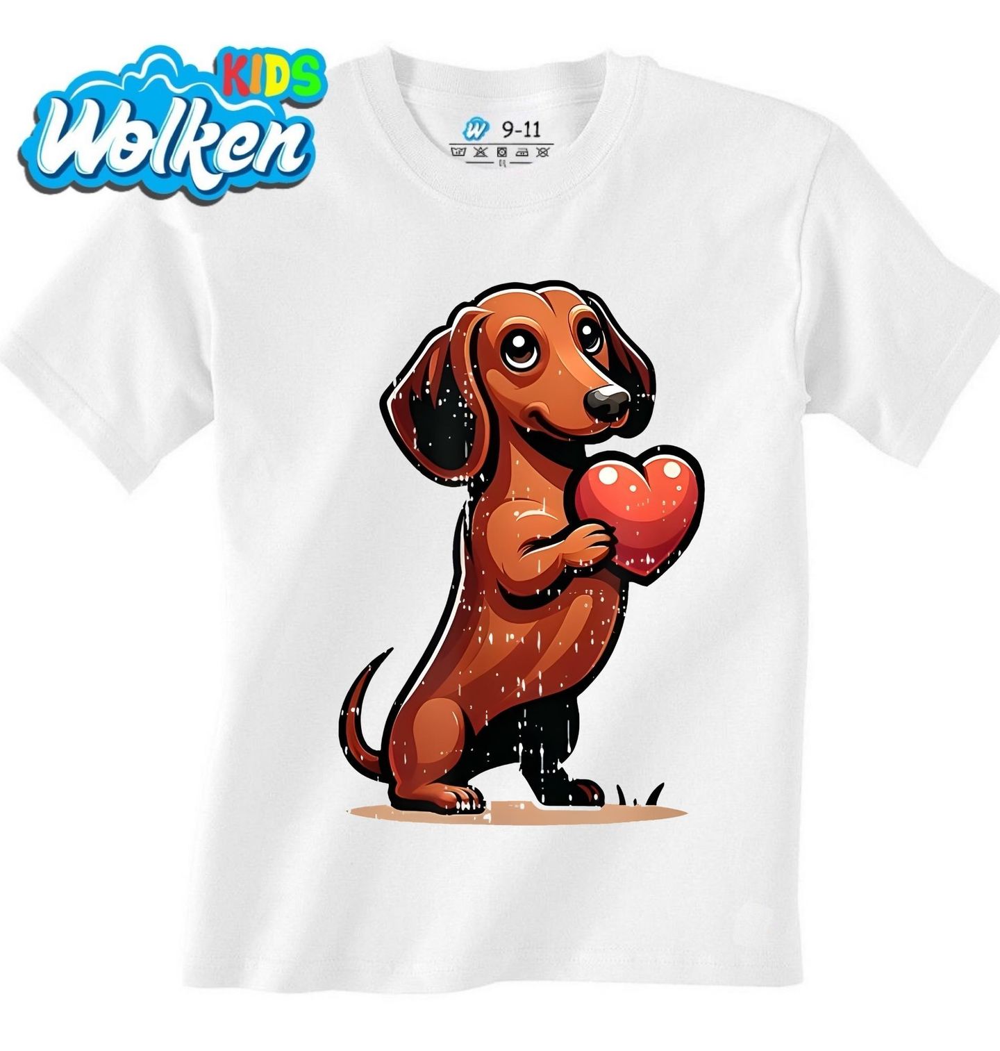 Dětské tričko Srdce Jezevčíka. Motiv roztomilého psa jezevčíka s červeným srdcem je ideální pro každého milovníka psů. Tento design potěší každého pejskaře, který ví, že pes není jen mazlíček, ale člen rodiny. Jezevčík, známý svou odvahou a oddaností, je tady ztvárněn jako srdcař, který si získá vaše srdce.