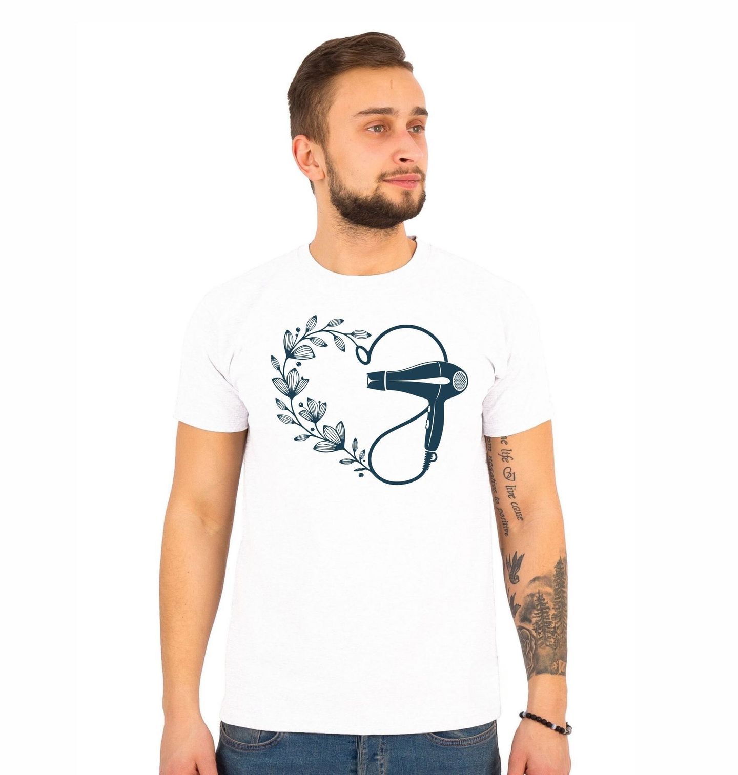 Pánské tričko Srdce Kadeřnice. Elegantní a jemný motiv, který dokonale vystihuje vášeň pro krásu a péči o vlasy. Design tvoří stylizované srdce, jehož součástí je fén doplněný o květinové prvky. Tento motiv je ideální pro každou kadeřnice, která miluje svou práci a chce ji hrdě ukázat světu. Symbolika srdce zde vyjadřuje lásku k řemeslu, kreativitu a radost z práce s lidmi.