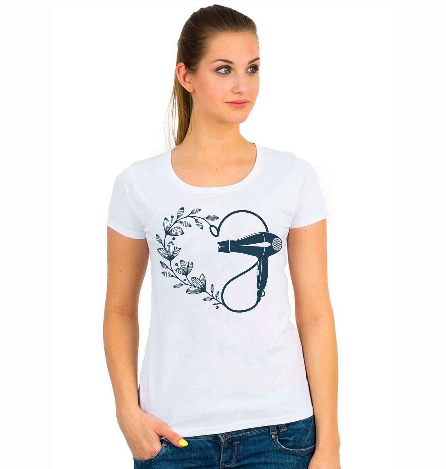 Dámské tričko Srdce Kadeřnice. Elegantní a jemný motiv, který dokonale vystihuje vášeň pro krásu a péči o vlasy. Design tvoří stylizované srdce, jehož součástí je fén doplněný o květinové prvky. Tento motiv je ideální pro každou kadeřnice, která miluje svou práci a chce ji hrdě ukázat světu. Symbolika srdce zde vyjadřuje lásku k řemeslu, kreativitu a radost z práce s lidmi.