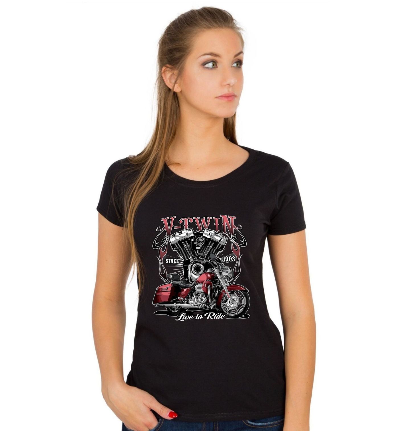 Dámské tričko Srdce Motorky V-Twin Engine. Motiv s ikonickou motorkou osazenou legendárním V-Twin motorem, který burácí od roku 1903. Dokonalá volba pro každého, kdo žije podle hesla „Live to Ride“ – jezdit je styl, svoboda i srdce na silnici. Tento design oslavuje historii silných strojů, syrovou krásu chromu a nespoutaný život motorkáře